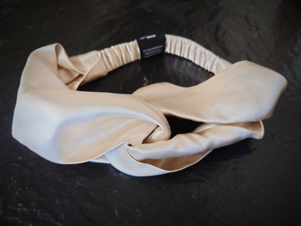 Don’t get me wrong, this headband from Blush Silks is beautiful, but it is not the colour that I was expecting. When I saw the “champagne” colour on their site, I interpreted it as having more of a golden hue, when in actuality it’s more of a beige. This fact is more than a little disappointing. I hate beige. The colour in certain lighting is the same as my walls, which I did not paint, and have often termed “puke”.