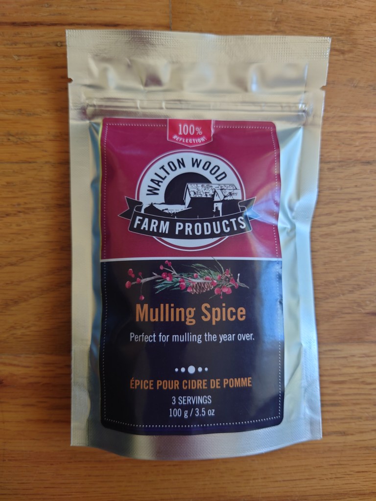 The tagline is cute: “Perfect for mulling the year over.” I’ll be honest, though, I didn’t really know what mulling spice was. Thankfully the French is more straightforward. This does not have an expiry date on it, but I’m guessing it’s better to use sooner than later.