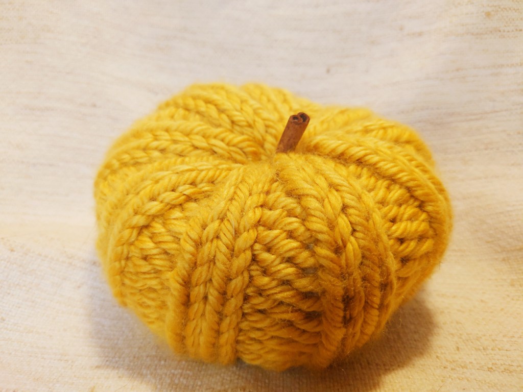 This is a nicely squishy kitted pumpkin. The yarn is soft and the stem is made of a cinnamon stick. It’s about 6″ in diameter and 3″ tall, so it’s a nice size. Not too big and not too small. The colour is a pleasant mustard yellow. It is officially the first fall decoration I own.