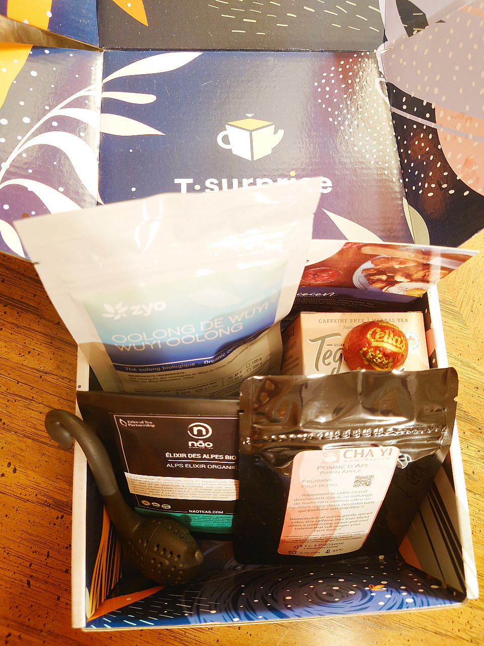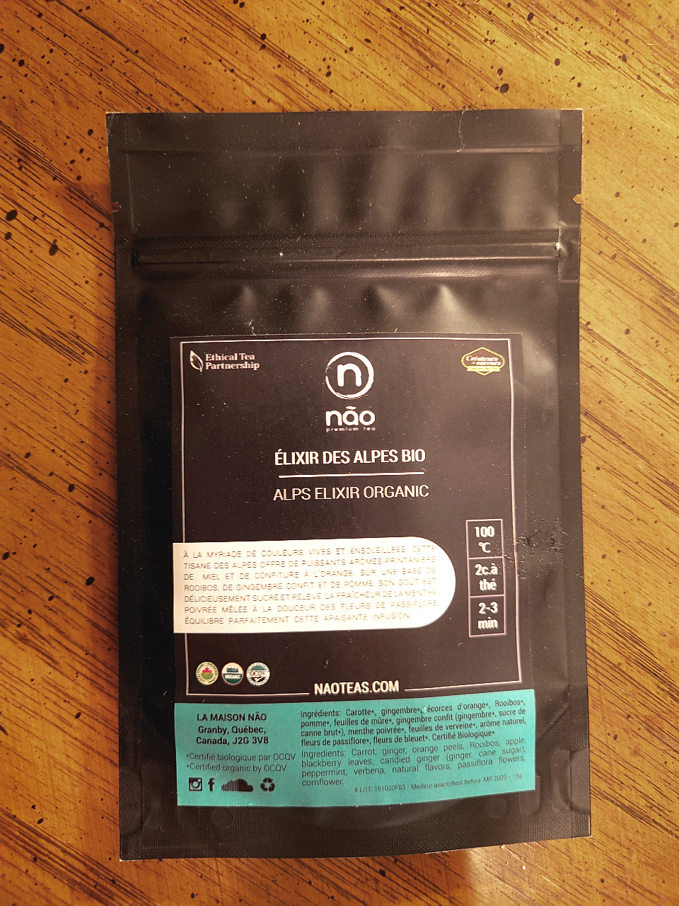 I’m probably going to get this confused with the mint and dark chocolate one in the cupboard. My French is pretty terrible, but I’ll try to summarize the description: A myriad of lively and sunny colours, this alpine herbal tea offers powerful aromas of spring honey and orange jam. With a base of rooibos, ginger confit, and apple, the taste is deliciously sweet and lifting. The freshness of the peppermint mixed with the sweetness of passion flowers perfectly makes this a soothing infusion.