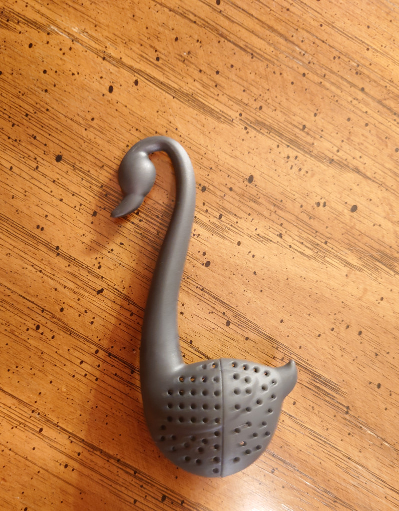 Another tea steeper! How excellent. I love that it’s in the shape of a swan and looks like it will hold a fair amount of tea leaves. Our ability to consume loose leaf tea grows!