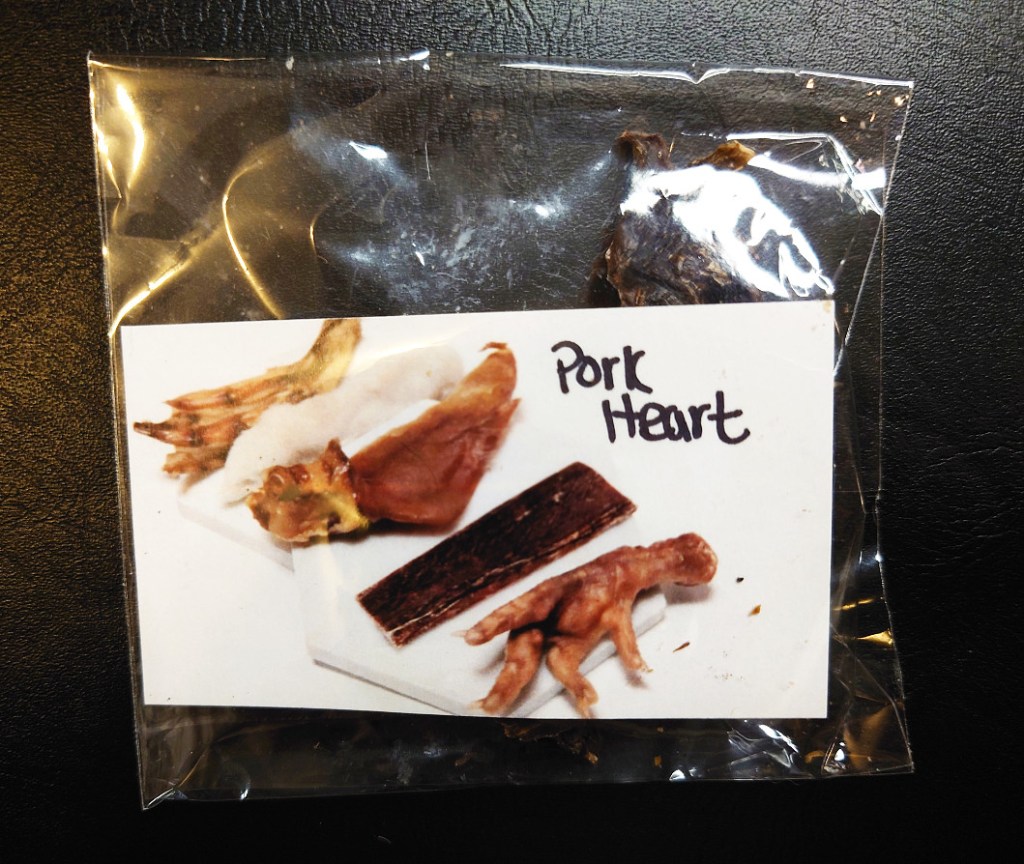 These are samples. If you haven’t read my opinion on samples, I don’t think they should be included in the overall value of a box. However, I do like Crumps, and I know my dogs love them, so I won’t turn my nose up at getting a few sample bags of it. There are 30g of treats here, and you can buy your own bag of 50g for $7.99 online. Having intentionally small pieces is really great for training, especially for freeze-dried things. When you try to break it up yourself it can often get messy, so to have it already done is great!