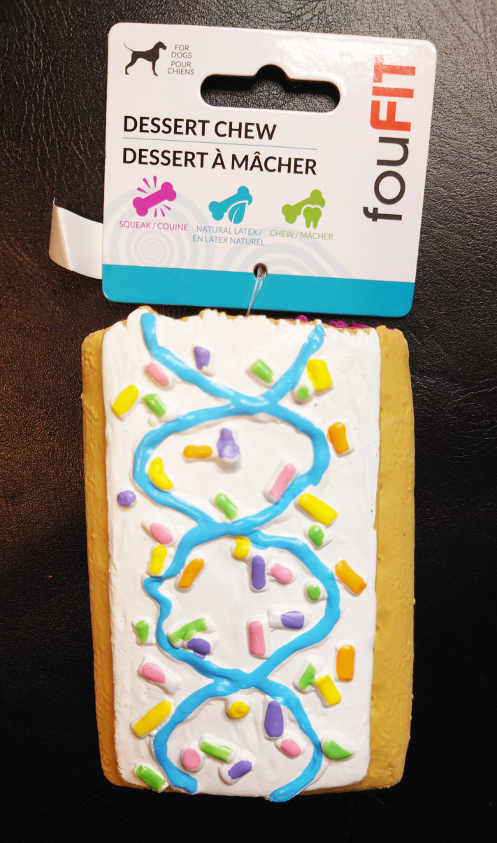 foufouBRANDS is a brand from Toronto with subsidiaries including fouFit. This chew toy is made from natural latex for gentle chewers. My dogs are not gentle chewers. They like to destroy. The puptart also squeaks!