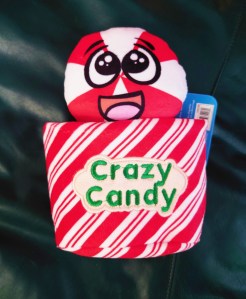 Another container with a “ball”. The candy has a squeaker and its container is crinkly. I’ve really noticed lately how much the dogs like crinkly toys. Obviously the ones that squeak are a big hit, but they love the sound of the crinkling as well.