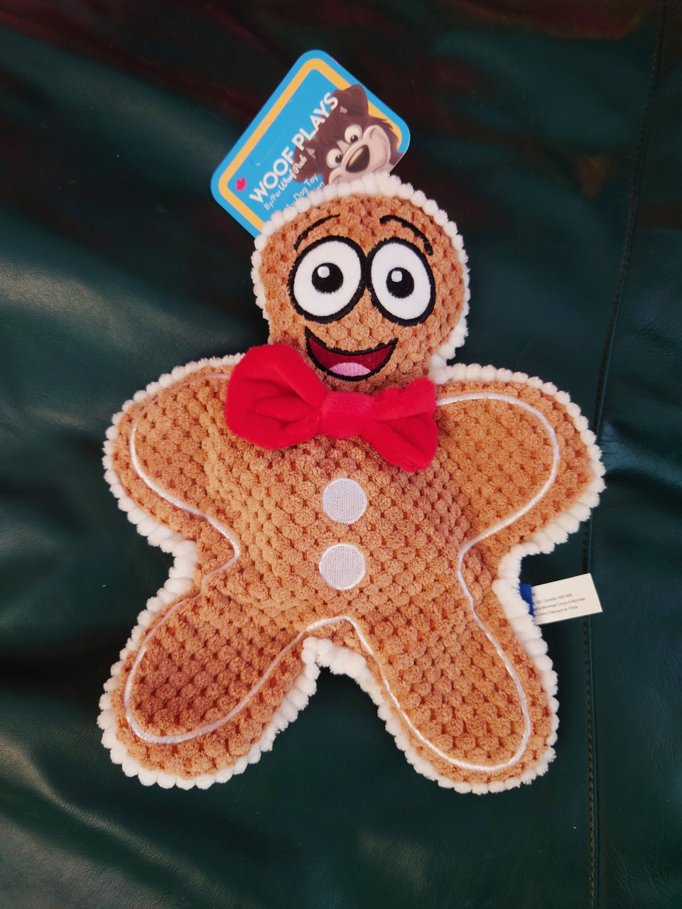 This gingerbread man is crinkly everywhere except for his left leg and contains two squeakers. One in his head and one in his belly. The bowtie looks like it will come off easily, so for dogs that are prone to choking on things, it might not be a good idea.