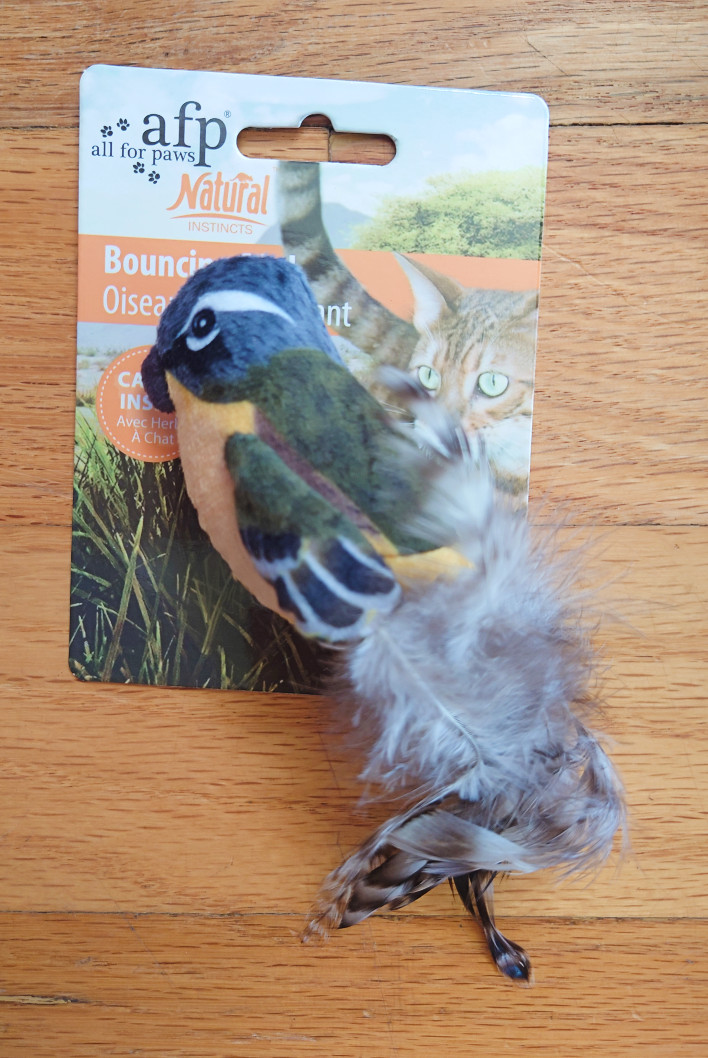 This is a beautiful little toy with real feathers. The body measures 3.5″ long and has catnip inside. The wings are also crinkly.