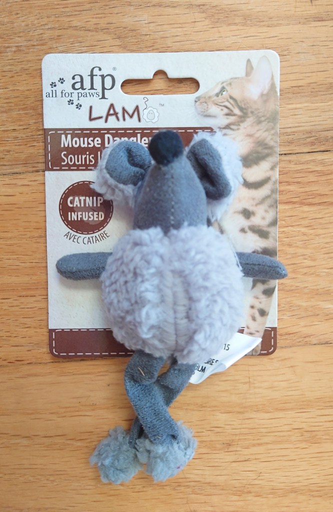 This mouse dangler is what I would consider a regular-sized cat toy at about 6″ long with the legs. This one has one tiny crinkly piece in it and some catnip as well.