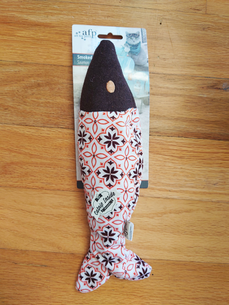 This fish toy is pretty large, as in it’s 12″ long. It’s very crinkly with catnip inside.