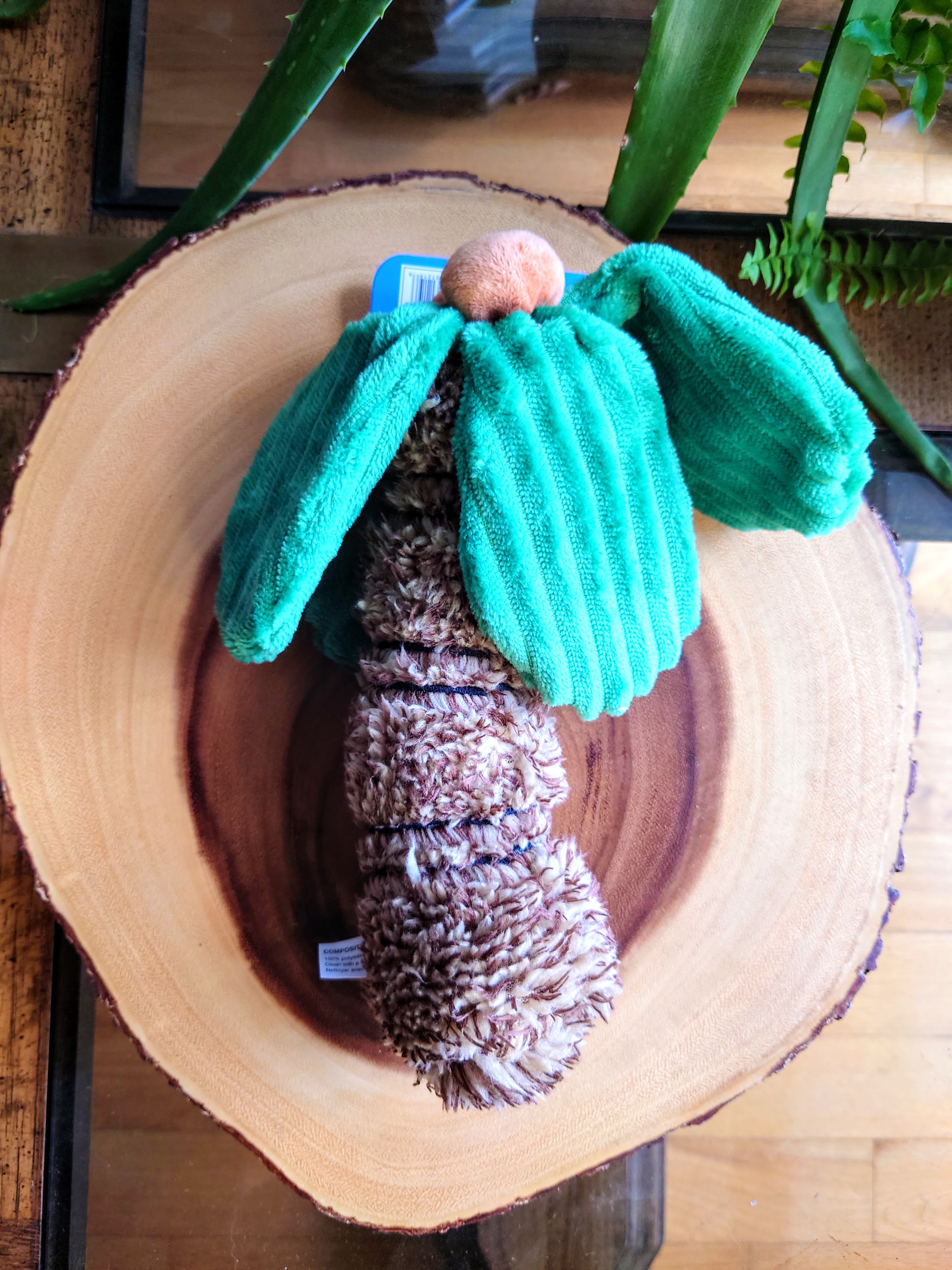 This “pom tree” has crinkly palm leaves and a squeaker in the trunk. The trunk is also very nicely soft. Won’t last long with Maila around, that’s for sure.