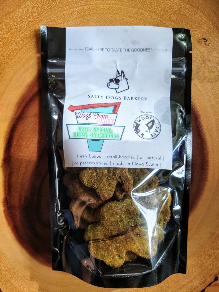 Another great treat bag from Salty Dogs! Ingredients: whole wheat flour, broccoli, spinach, fish broth, seaweed, coconut oil, baking powder.