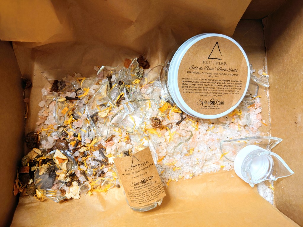 The sad carnage of a rough trip across the country. My fire incense and bath salts are a great mess. Sad times.