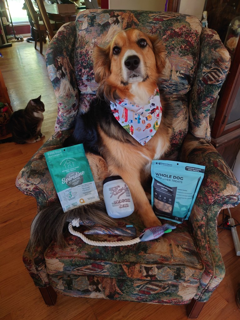 This month’s chews I think were bully sticks. They were quickly enjoyed by the pups after patiently waiting for us to finish the video.