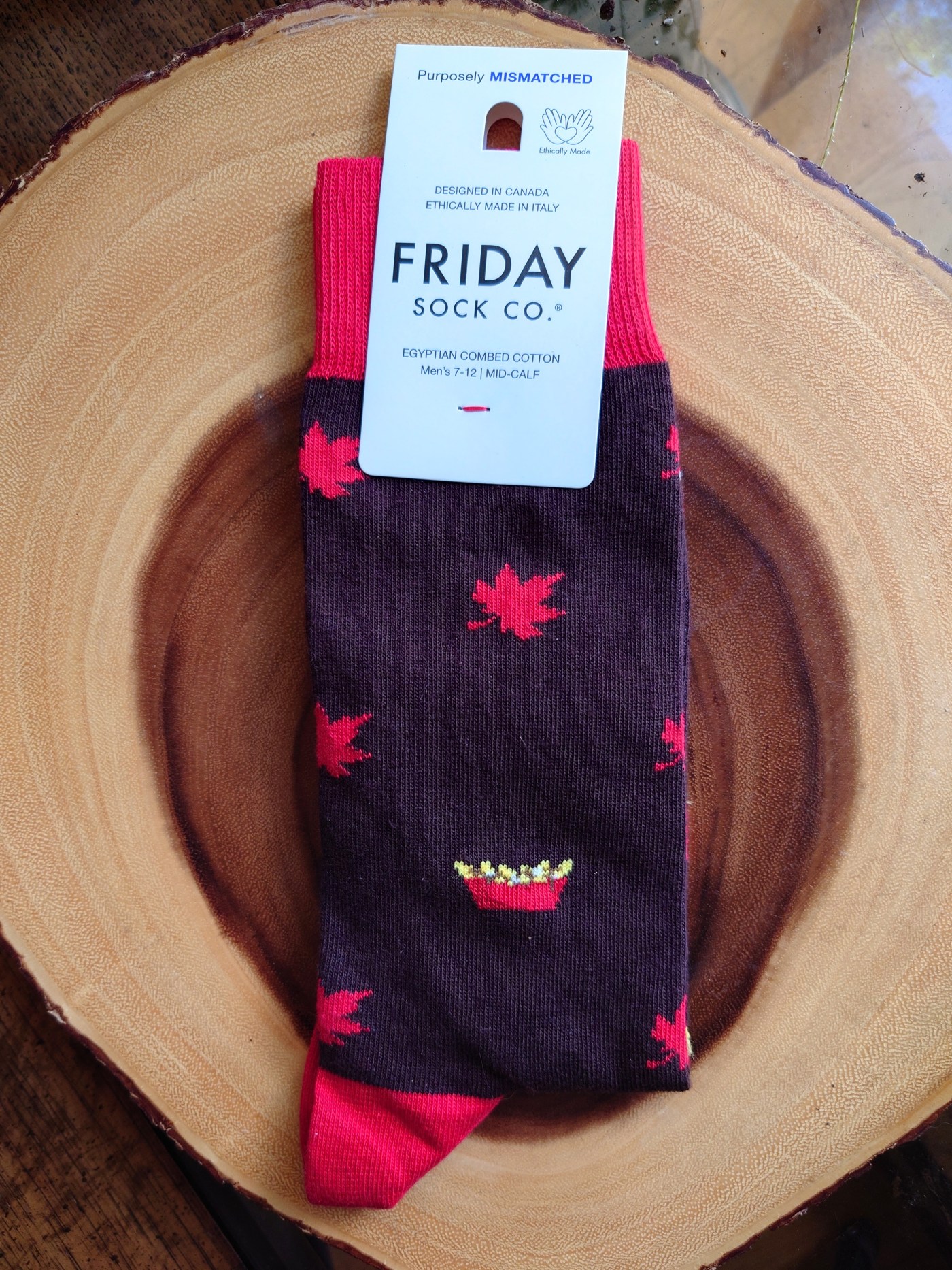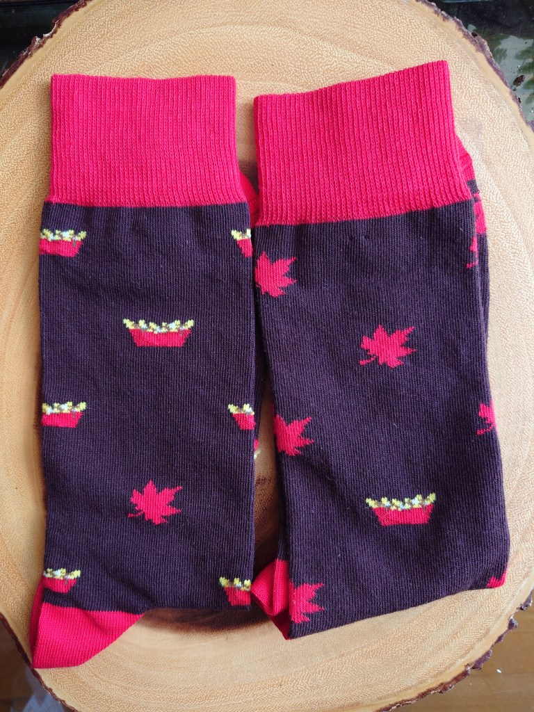 It’s May and we’ve got a pair of socks with very fall colours and a nod to Canadiana with maple leaves and poutine. Odd time of year methinks, but I’ll take it. I think most of the world forgets about Canada, even Canadians ourselves, which is part of the reason I started this blog. Having a world power speaking the same language next door drowns out our own products, innovations, and culture. I’d like to change that. Not necessarily with this blog, but with other projects that are in the works.