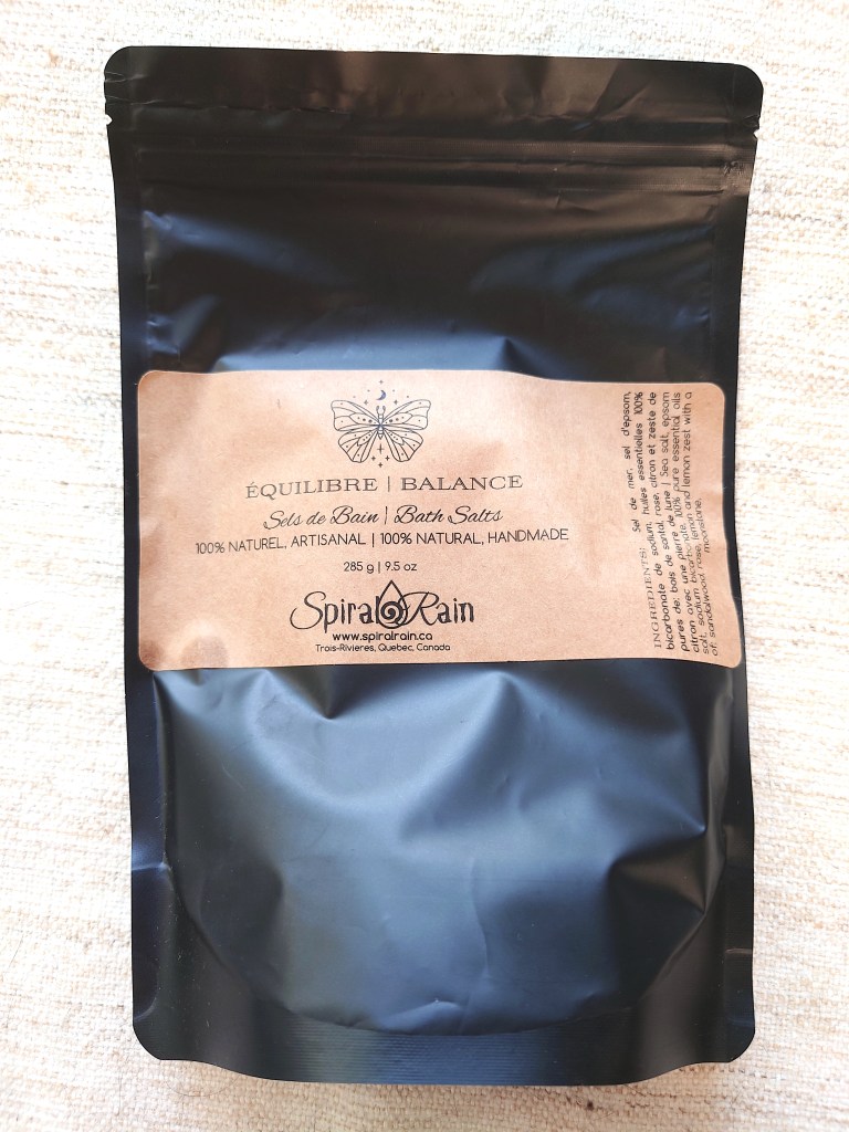 This is a giant bag for a very small amount of bath salts. It’s like a chip bag where they’re mostly air. This is about 1/3 full at 285g. I don’t see or feel a moonstone inside of this bag, so I think that might explain the small, second moonstone that we received. The contents list only mentioned one, whereas the ingredients of the bath salts includes one.