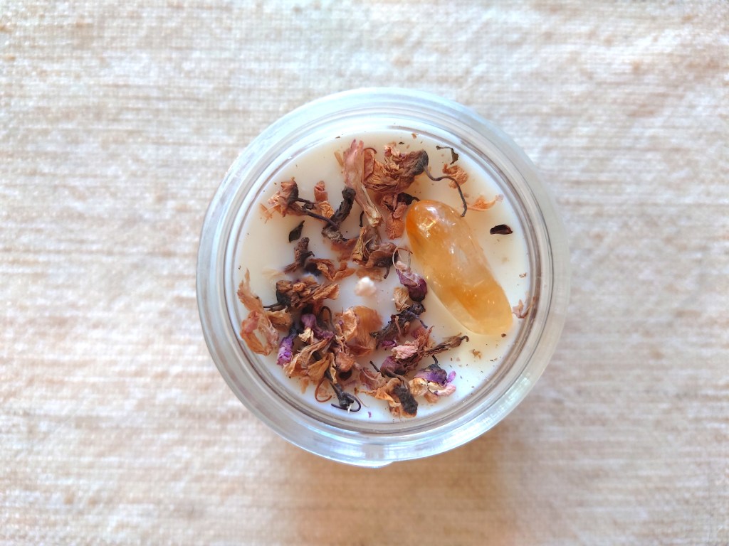 This candle is lemony ginger with citrine and dried violet on top. The scent is sweet with a touch of citrus.