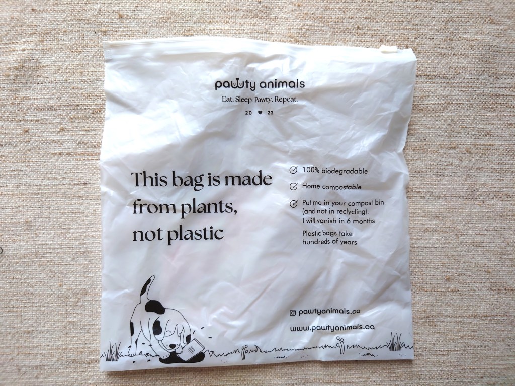 Last week Ryan e-mailed me to do a 7-month check in to see if I was still happy with how my subscription is going. He asked if I wanted to make any changes, and to let him know if there is anything I’d like to see in future boxes. I’m still fantasizing about an eco-friendly dog box, with biodegradable toys, but at least this month’s Tim Pawtons toy came in an apparently home-compostable biodegradable bag. I am going to test this out. Here is the bag: