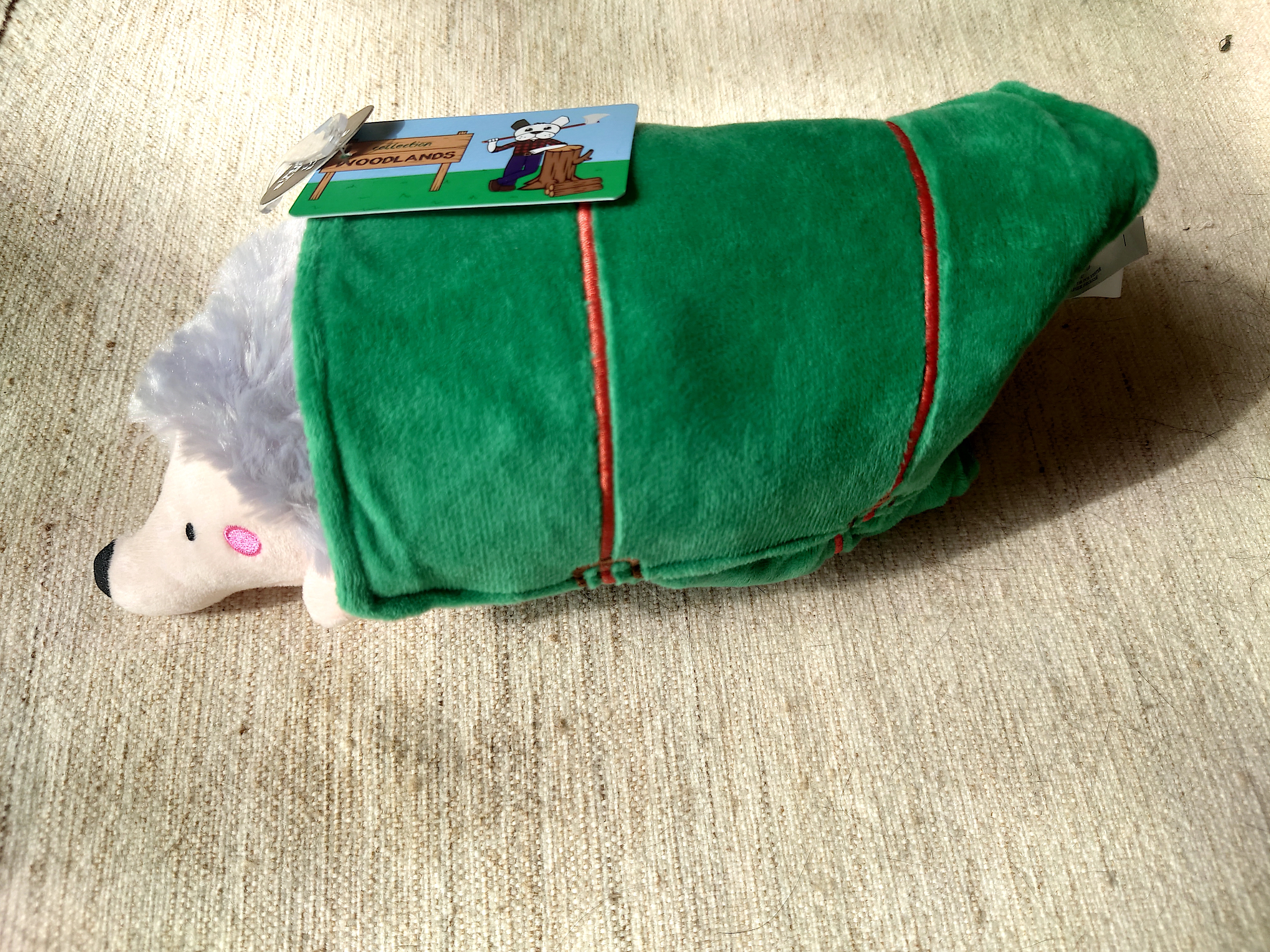 A very cute 2-in-1 toy with a crinkly bed roll and a squeaky hedgehog. I cannot find any information on this brand.