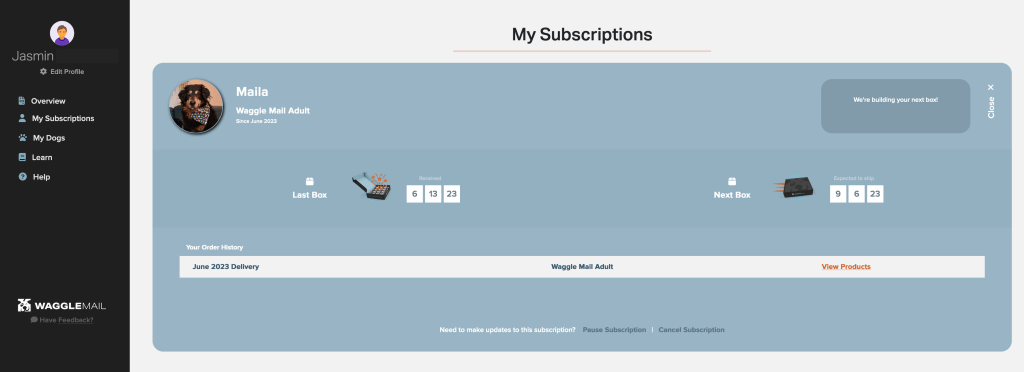 Focus: “Waggle Mail blends convenience with customization, choosing quality, trustworthy products that support your dog’s age, need and breed.”