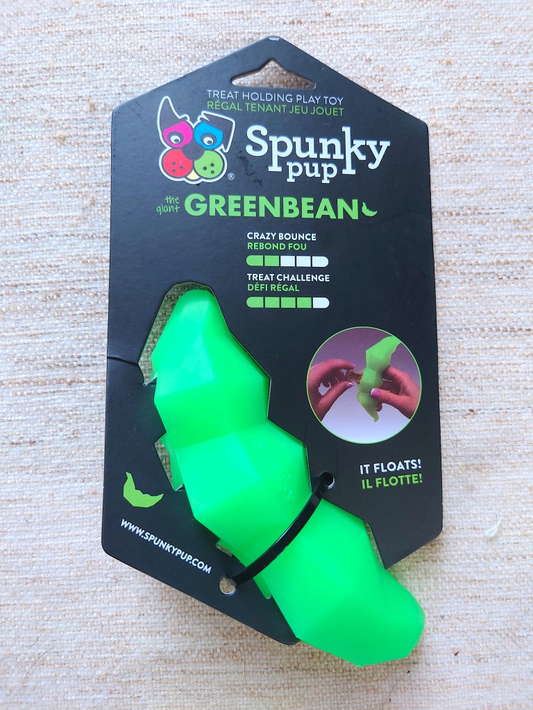This greenbean is made of an unknown material that is apparently recyclable and dishwasher safe. It is meant for small dogs, so I’m not sure why this ended up in my box. It’s not intended to be used as a chew toy, but I did specify that Maila is a big chewer. It also says it’s a fairly high treat challenge, but the slots are so big, I very much doubt it. I just threw it to Maila and one of the treats came out. She seems to like it though, and has been chewing on it for a while now.