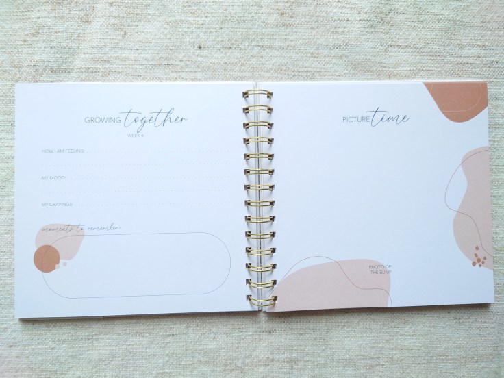 This journal is about the pregnancy, with entries on how one found out about being pregnant, how they told their family, and weekly logs of symptoms and a space for a bump picture. There’s also a small to-do section with a hospital packing list. I’m aiming for a home birth, so that’s not relevant to me. There is also room for some pictures after the birth.
