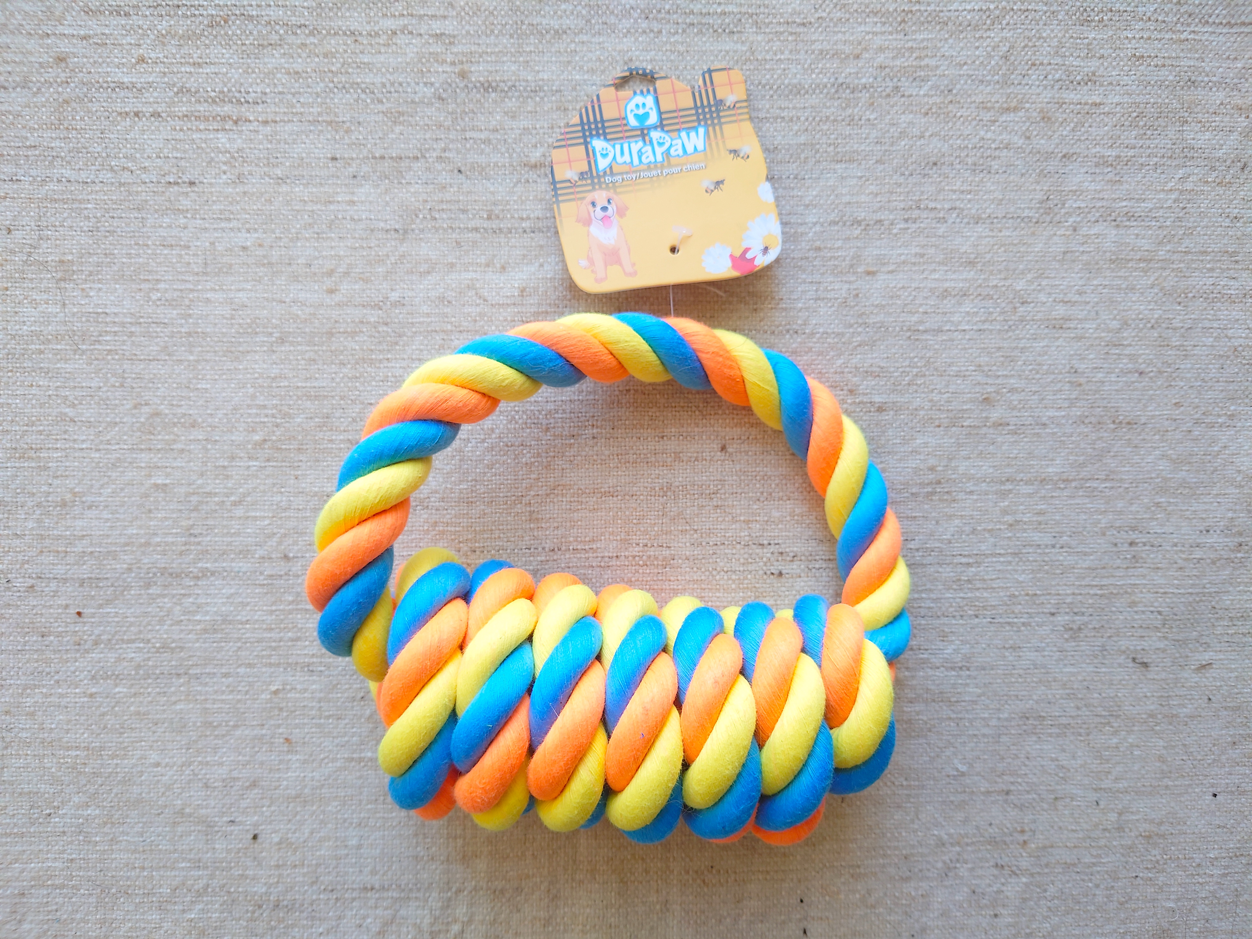 This rope toy seems to be pretty good quality, and possibly made of cotton threads, though it doesn’t actually say. Blue and yellow are colours that dogs can actually see, so two of the three are great for the pups.