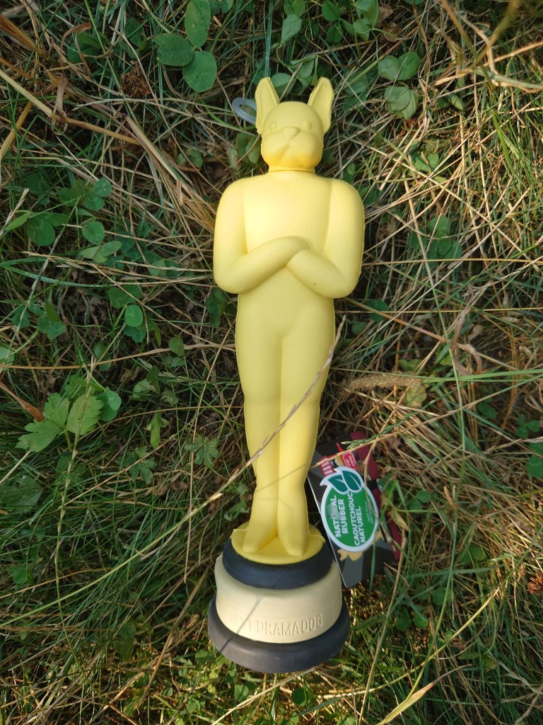 This squeaky toy is made of natural rubber and can have treats stuffed into the bottom. The award is for the best drama dog, which in my household is definitely Coco.