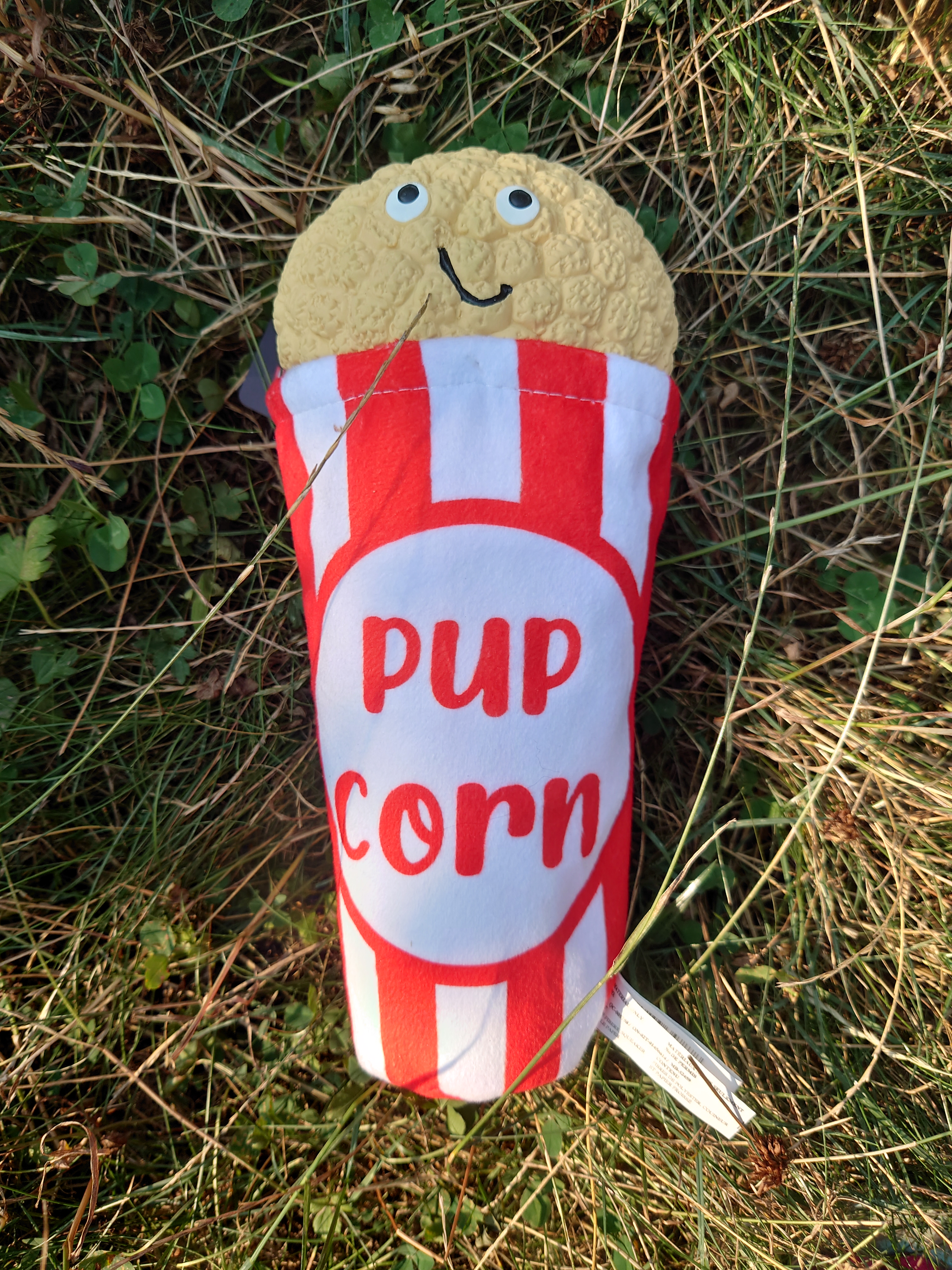 This may be the ugliest popcorn I’ve ever seen, but it’s going to make a great toy! The bag itself is filled with crinkly material almost to the top. The popcorn is sitting on top, currently tied in with plastic tags and seems to be made of rubber with a good squeaker built in. A really great toy combo!