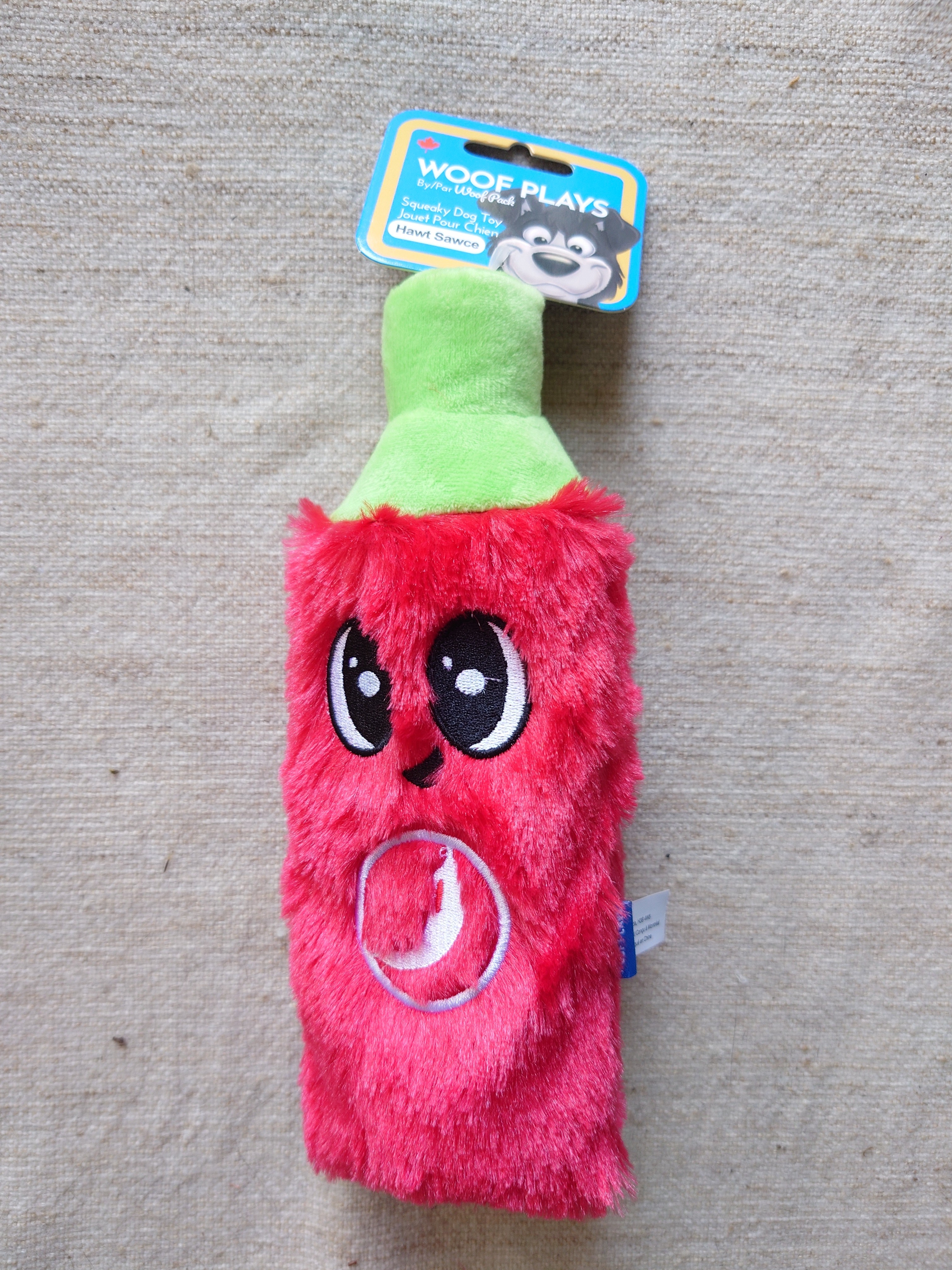 This has a plastic bottle with a squeaker in the lid. The hawt sauce is actually a cover, which opens with velcro on the bottom. The means if you wanted to stuff it with something else, you would be able to. My dogs absolutely love squeakers and crinkling things, so this will be a hit for sure.