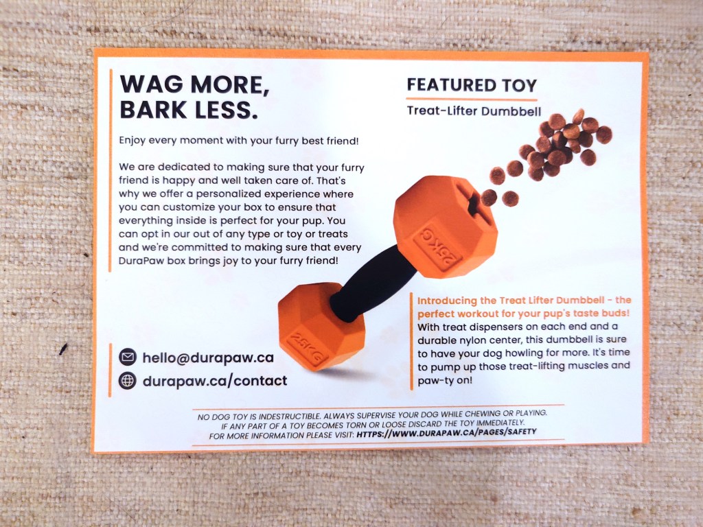“The DuraPaw Ultimate Enrichment Dog Subscription Box comes loaded with 3 to 4 durable enrichment toys, 1 bag of delicious Canadian-made treats, and a fun customized dog accessory.”