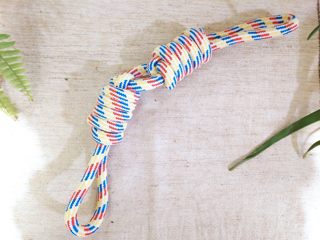 This rope toy seems to be pretty good quality, and possibly made of cotton threads, though it doesn’t actually say. Blue and yellow are colours that dogs can actually see, so two of the three are great for the pups.