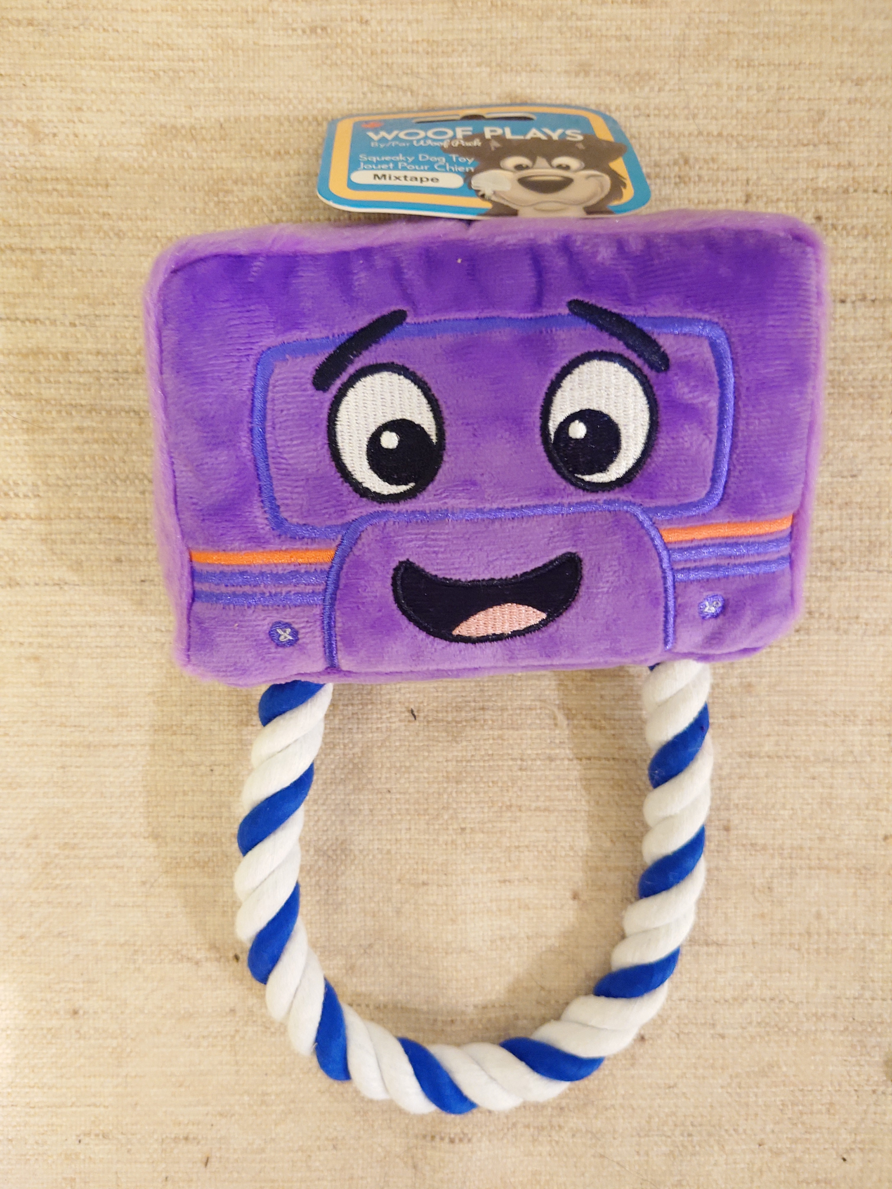 The mixtape toy has a squeaker in the face, and a sturdy rope for tugging.