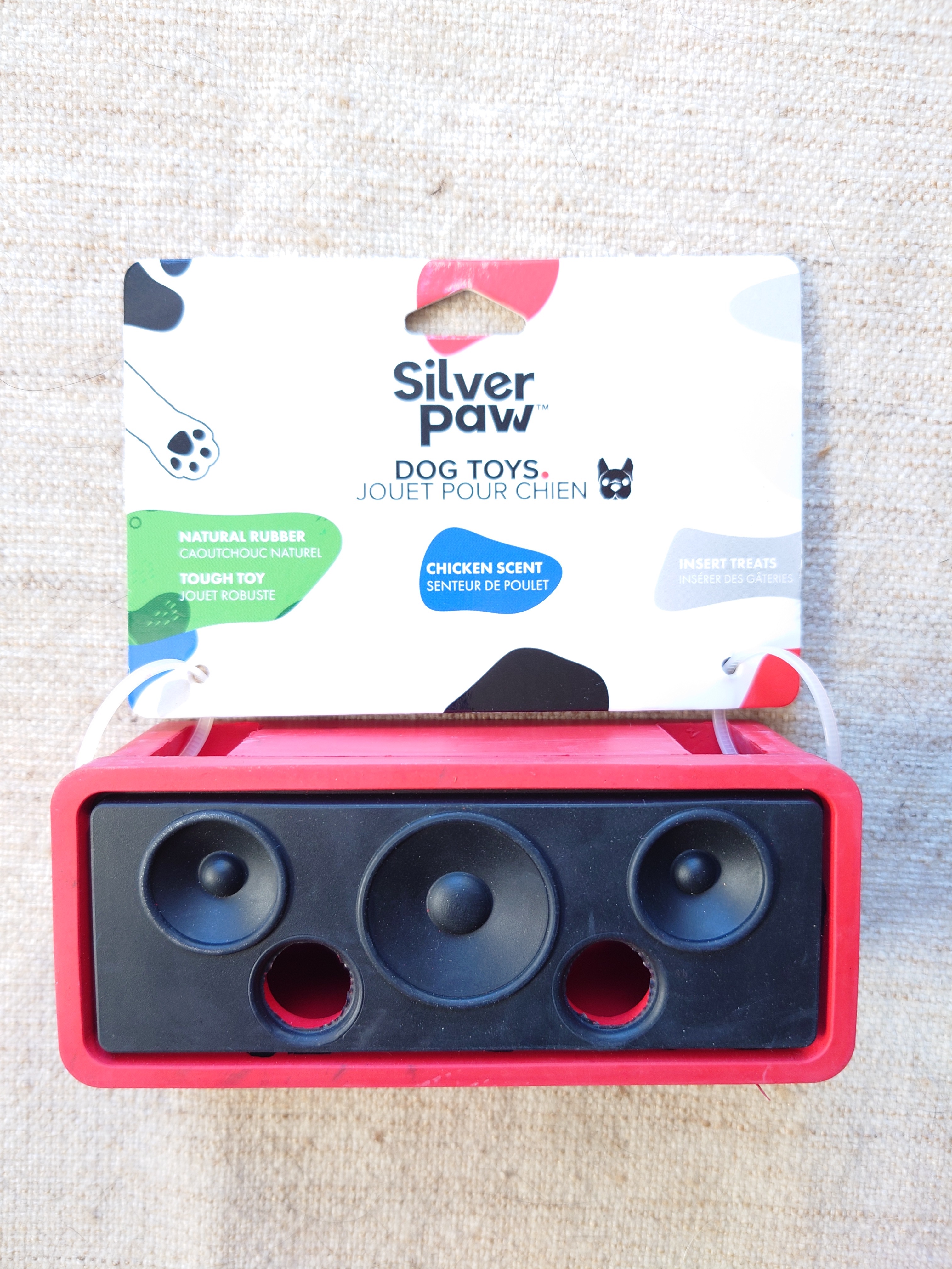 It doesn’t really smell like chicken to me, but when I took it out of the box, Coco came up to me and started sniffing. Clearly it’s something that she can smell! This toy is made of natural rubber and is able to hide treats inside.