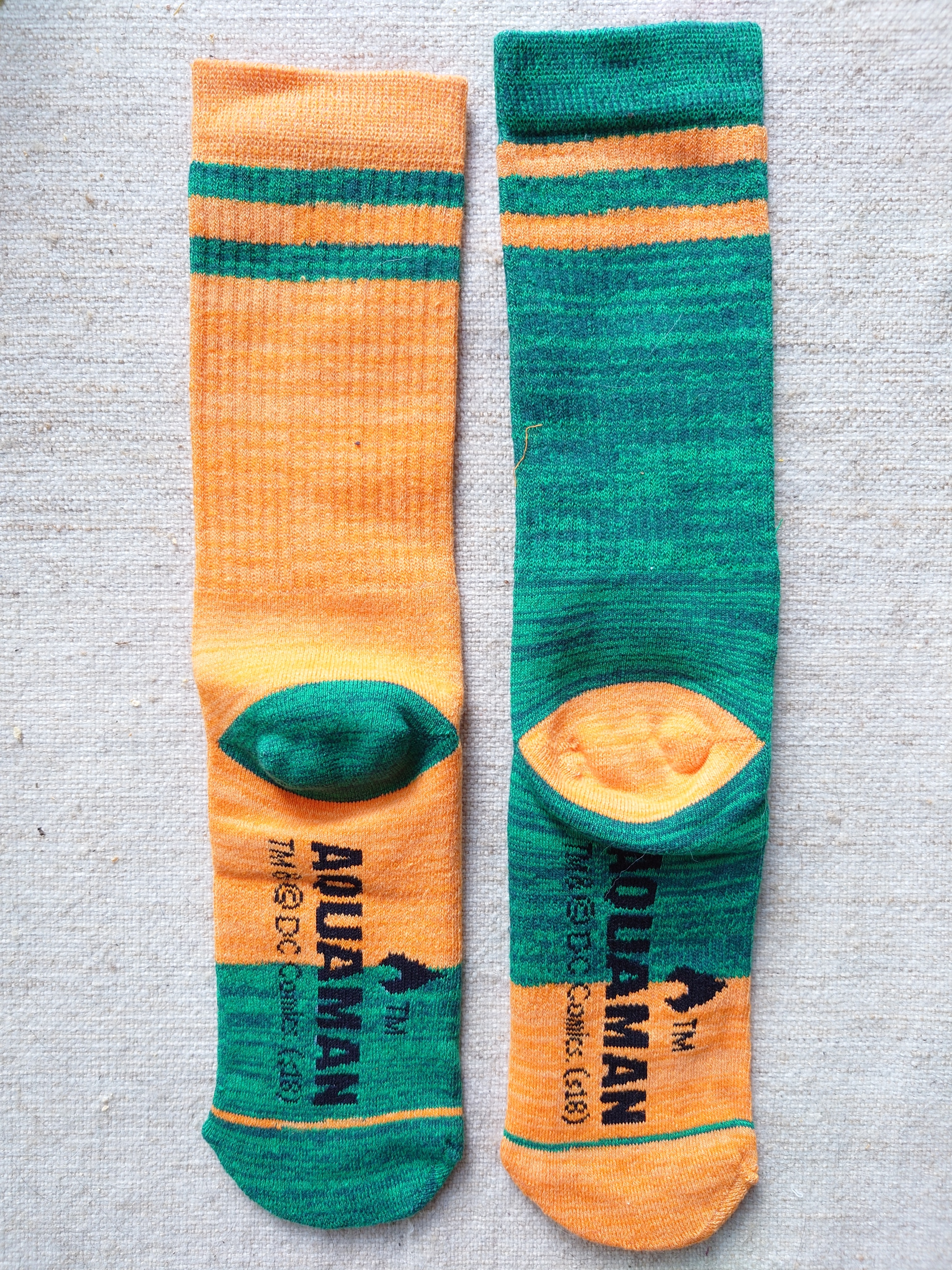 These socks are nice and thick, so they should be perfect for winter. They are also Aquaman themed, which is interesting. The company that produces these is called Bioworld, which has a massive variety of products with many pop-culture themes.