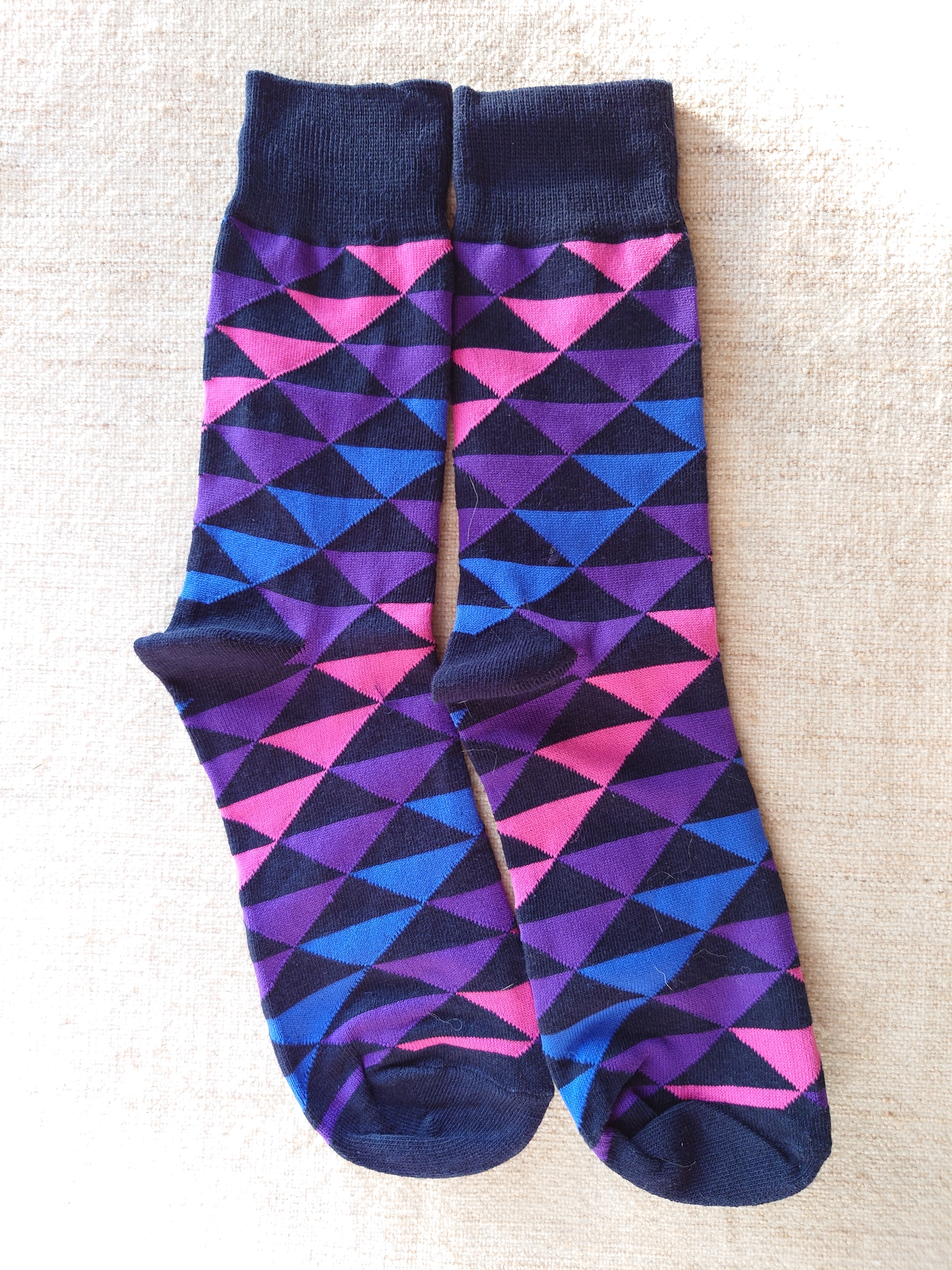 This is the only non-duplicate pair this month. The colours and pattern of these socks are delightful. They were made in China of 80% cotton, 15% spandex, and 5% elastane.