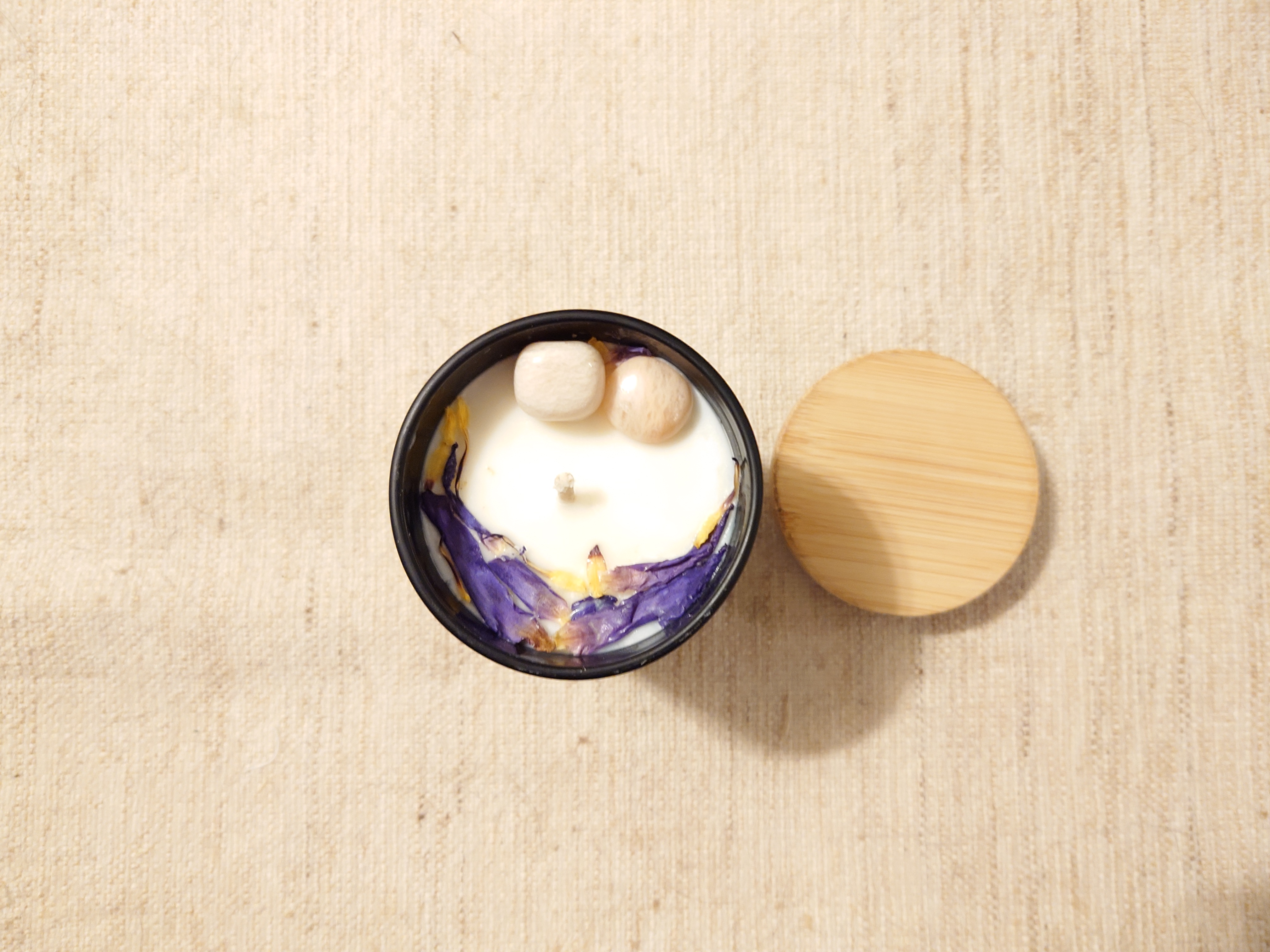 This candle is valued at $25 and is topped with lotus and two moonstones. The scent is “fruity jasmine” which seems accurate. The lid does not sit on top of the candle because of the stones, but once they are removed, the lid sits on okay. The fit is a little weird, but that has nothing to do with Spiral Rain.