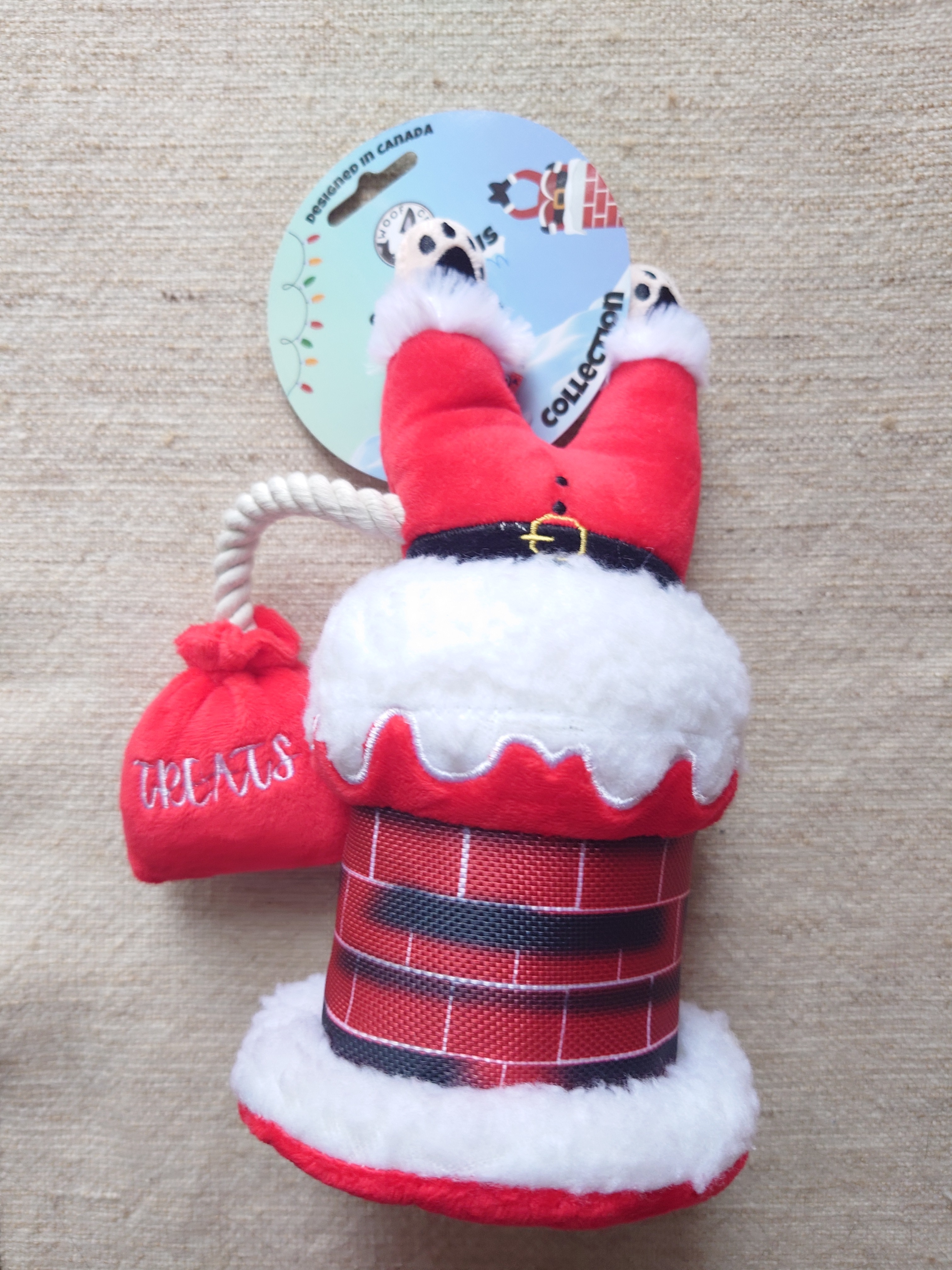 Santa Paws got stuck in the chimney! At least his bag of treats is still out and accessible. This hilarious toy is crinkly and contains a squeaker in the chimney.