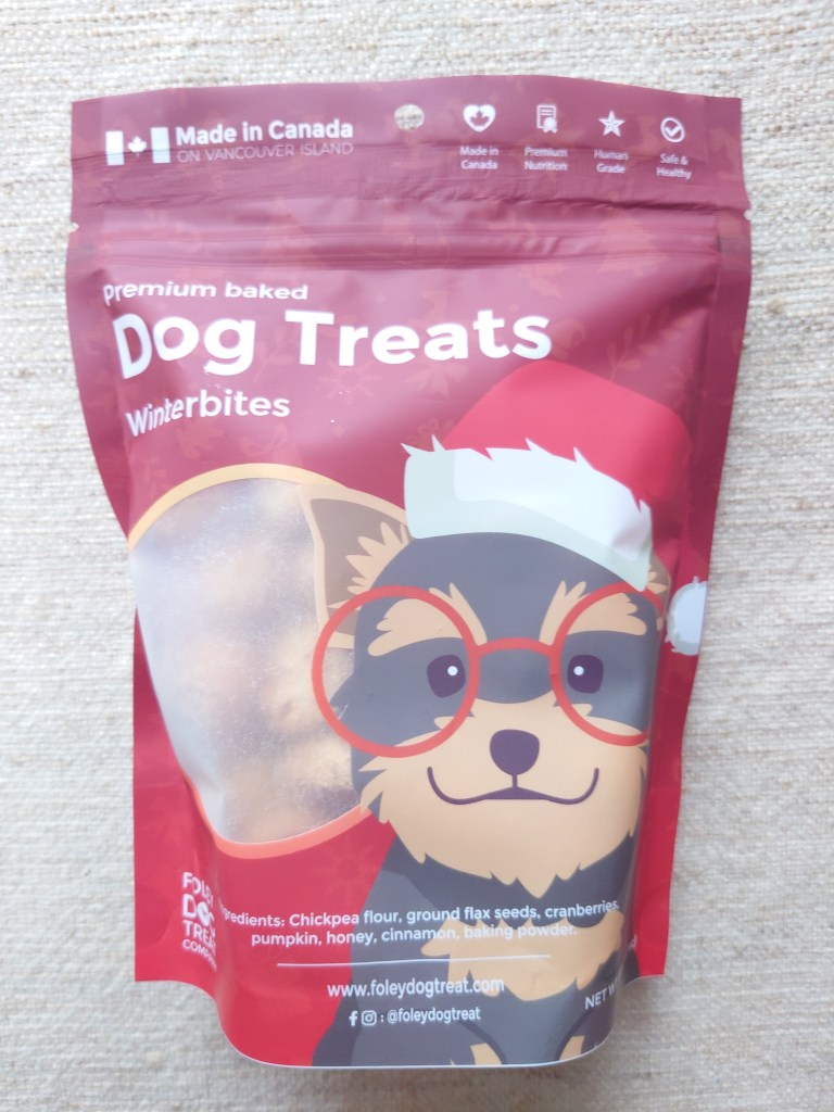 These winterbites treats contain chickpea flour, ground flax seeds, cranberries, pumpkin, honey, cinnamon, and baking powder.