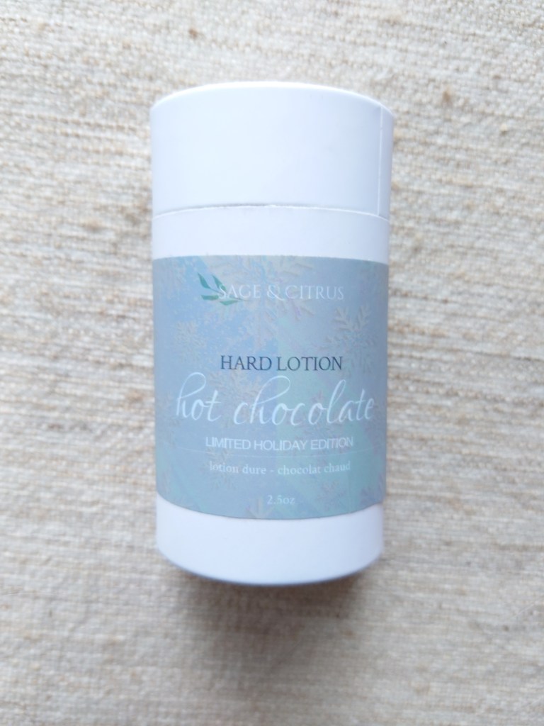 I’m not really a fan of hard lotion. I find it cumbersome, messy, and hard to get the appropriate amount. On a positive note, the ingredients are: beeswax, cocoa seed butter, coconut oil, vanilla fruit oil, vitamin E, and cacao extract.