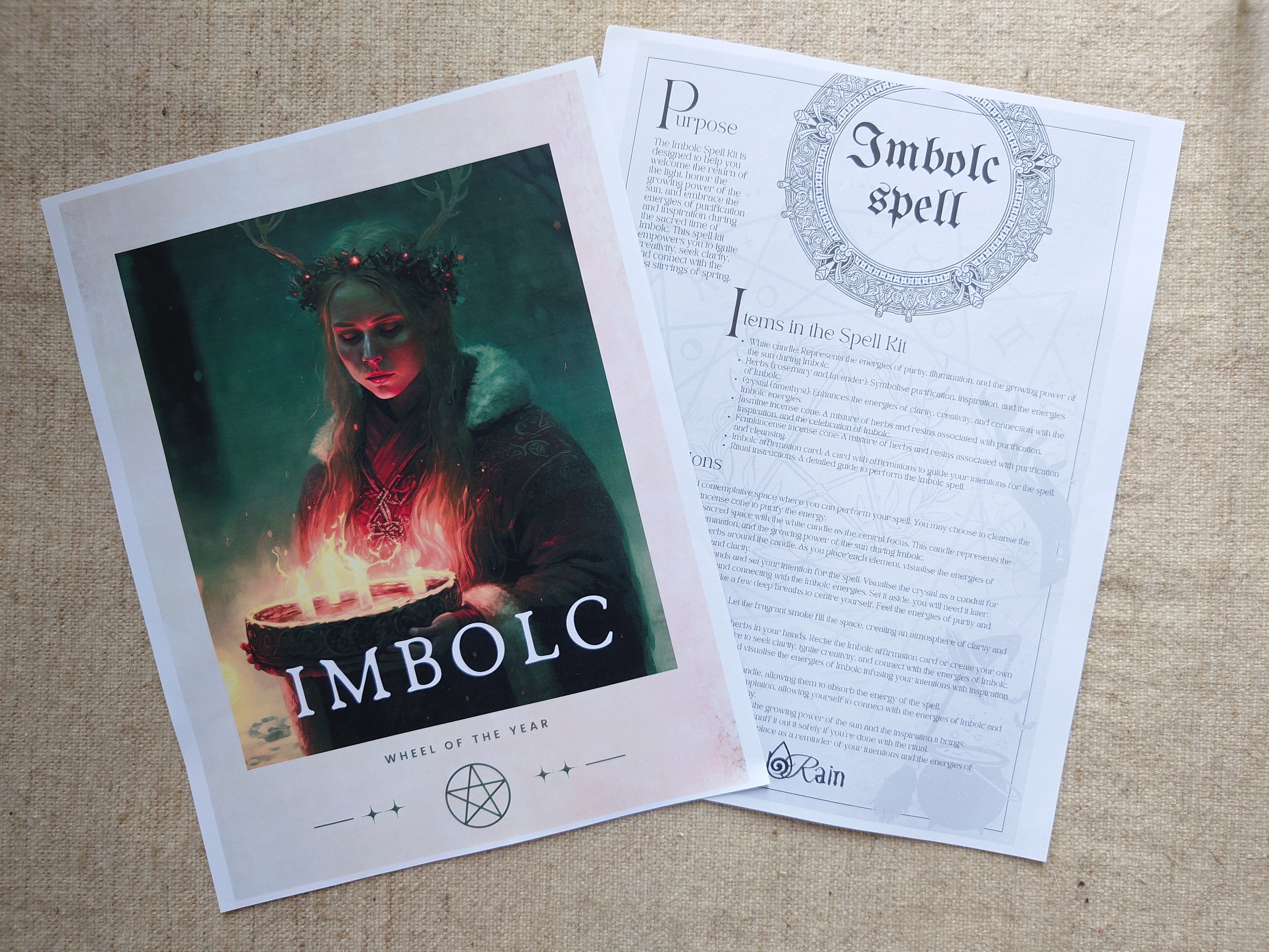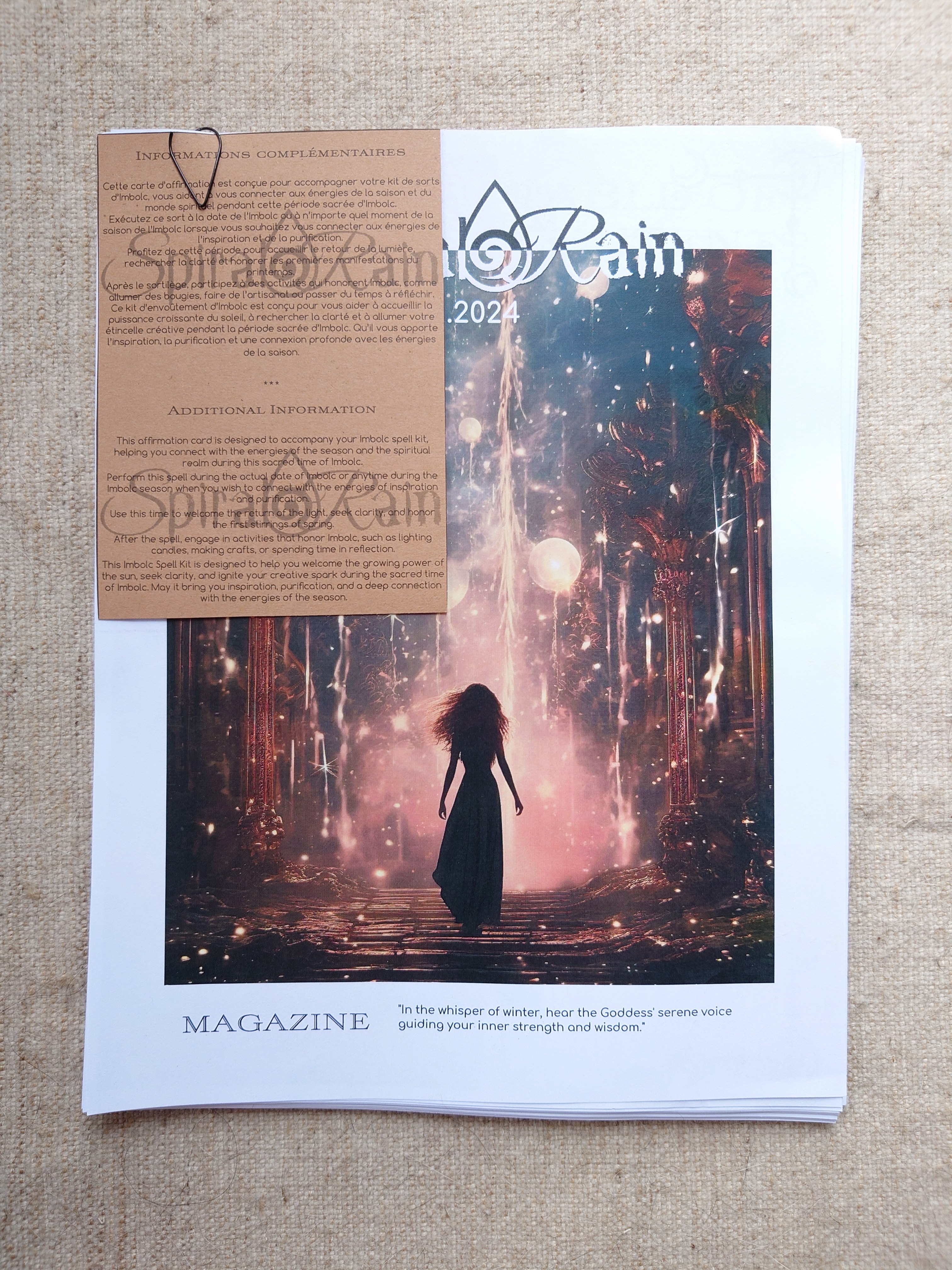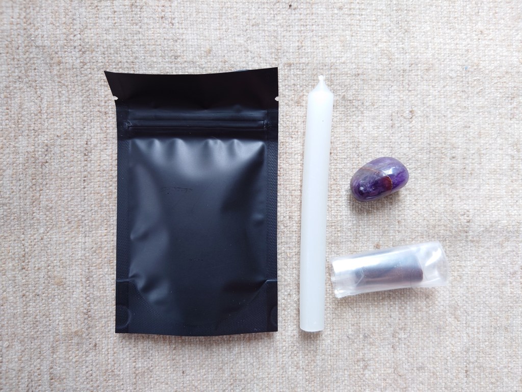 This spell kit should have the additional information/affirmation card with it to help connect with the sabbat. In any case, this kit contains an amethyst, a candle, a smelly jasmine incense and frankincense incense, and an unlabelled bag of lavender and rosemary.