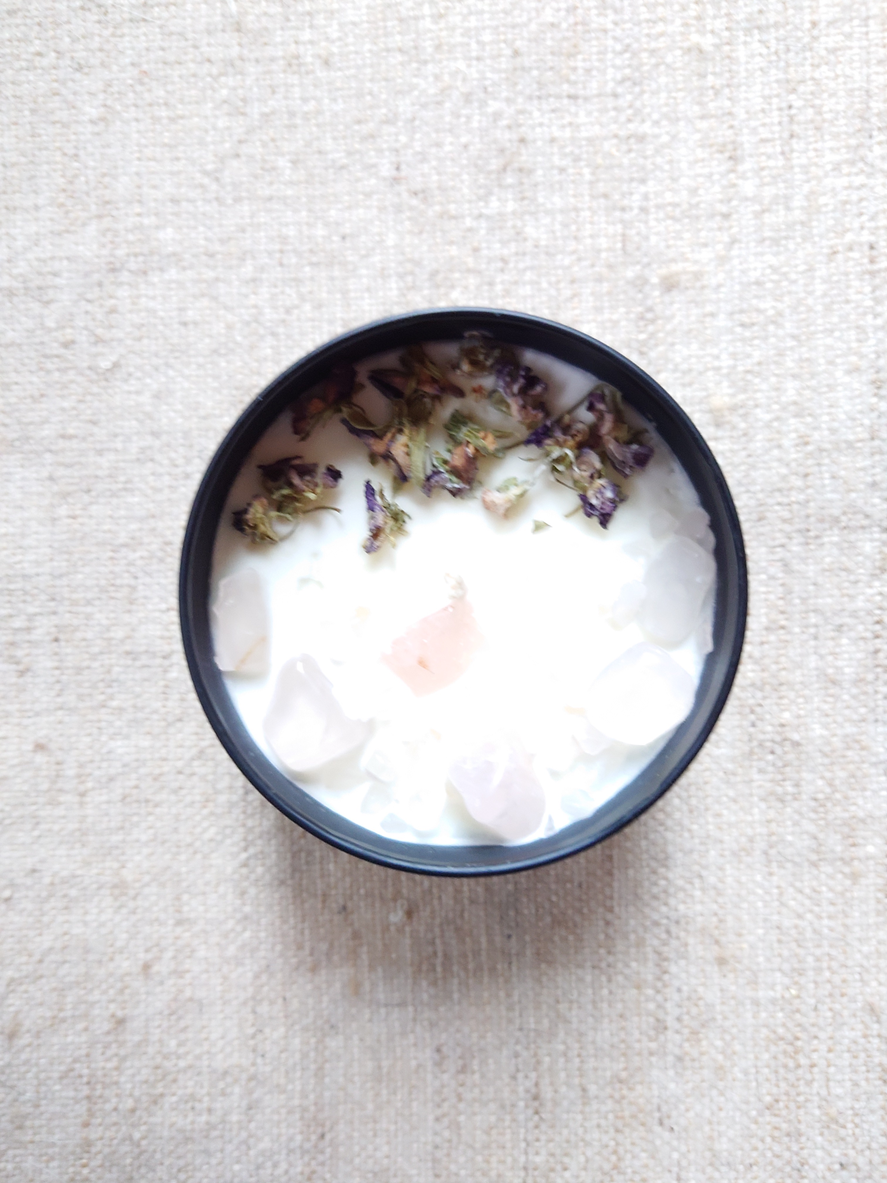 It’s hard to tell, but this candle contains rose quartz and spring violets.