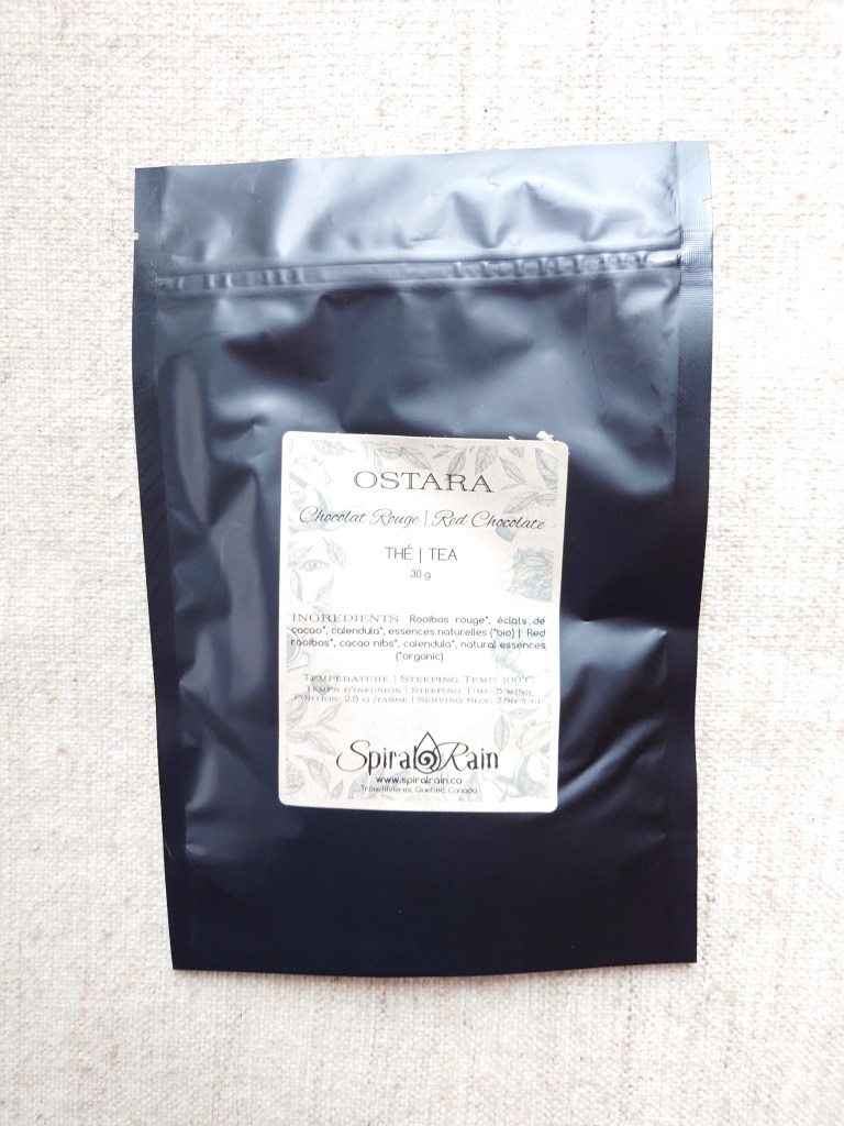 This 30g bag of tea to celebrate Ostara contains red rooibos, cacao nibs, calendula, and natural essences. I’m curious to try it.