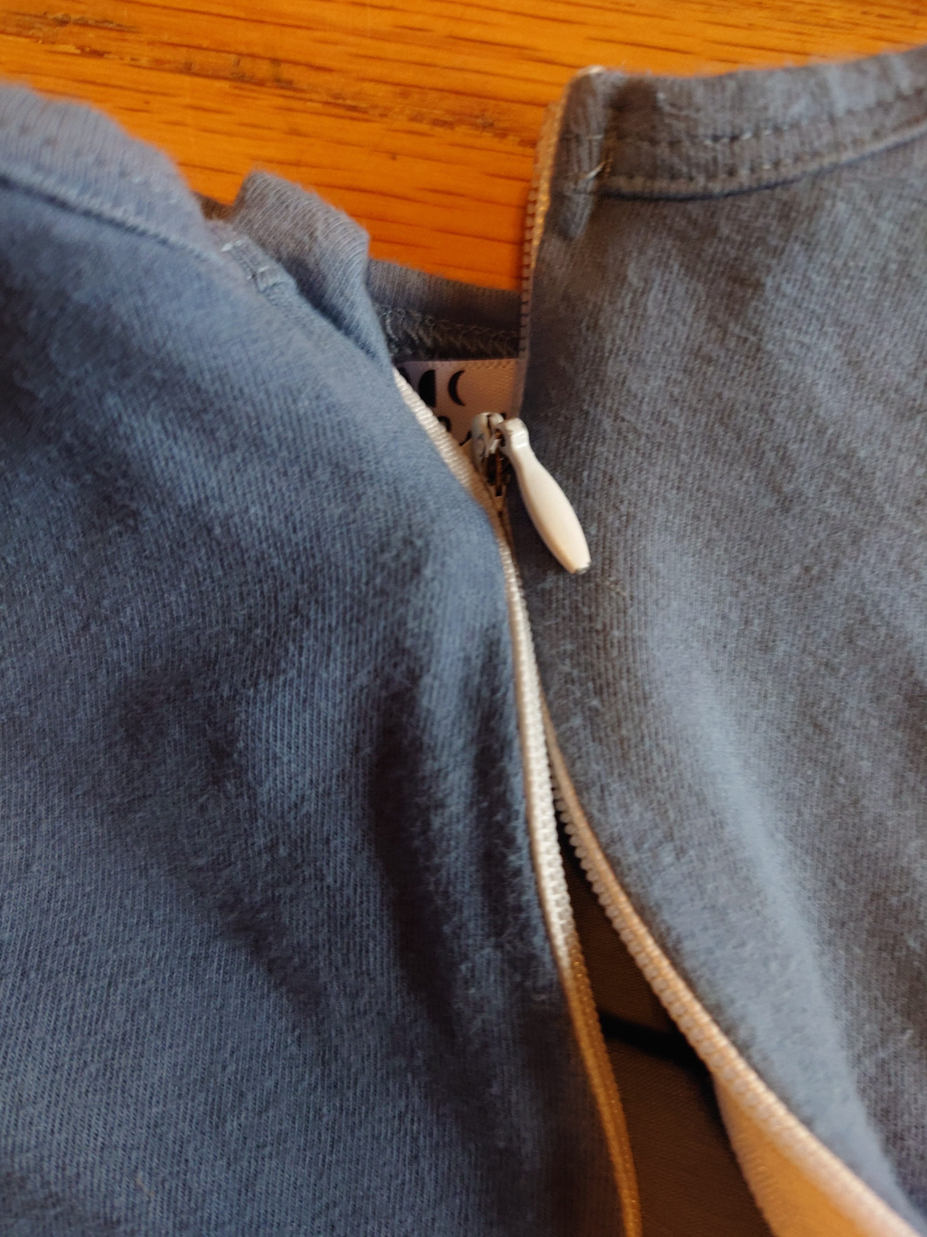Despite being made in Canada, I was not impressed enough to purchase from this company again. First off, the package smelled like stale cigarettes when it arrived, and the individual items also had a variety of bad smells. That might be a manufacturing or warehousing problem, which may or may not have been fixed by now as it has been 11 months. The zipper is the thinnest zipper that I’ve ever encountered. Its size helps it to become mostly hidden when zipped up, but comes with its own problems. The material is a cotton-spandex blend, which allows for some stretch, but nothing like the bamboo blends. I actually prefer cotton over bamboo, but it is more restrictive.