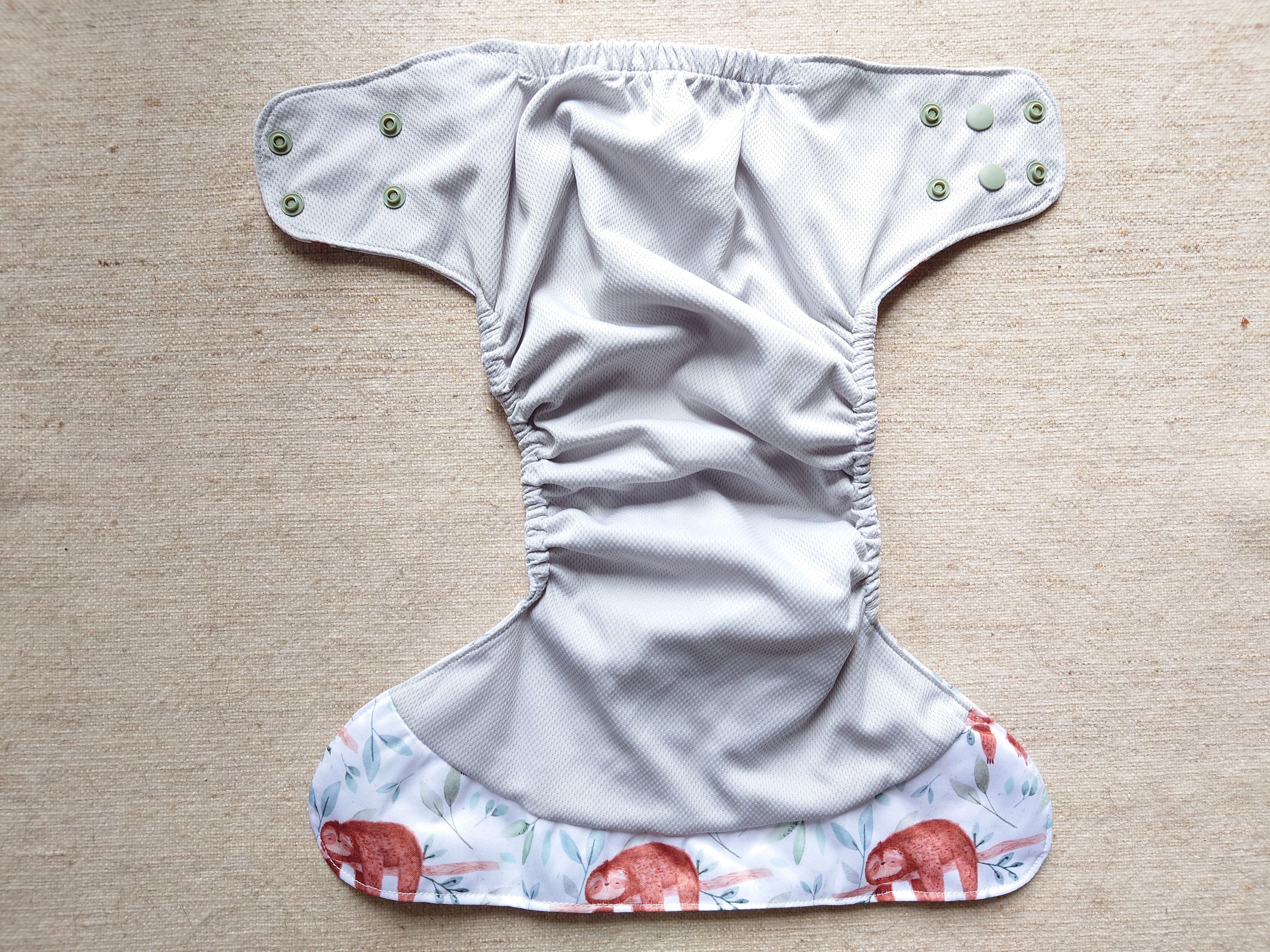 These are pocket diapers that have an athletic wicking jersey mesh that goes against the skin and a PUL exterior to keep it relatively water proof. They have four hip snaps on each side and four rows of vertical snaps to adjust length. There is also a snap in the pocket near the tummy if you like to snap in inserts. I don’t like to do that.