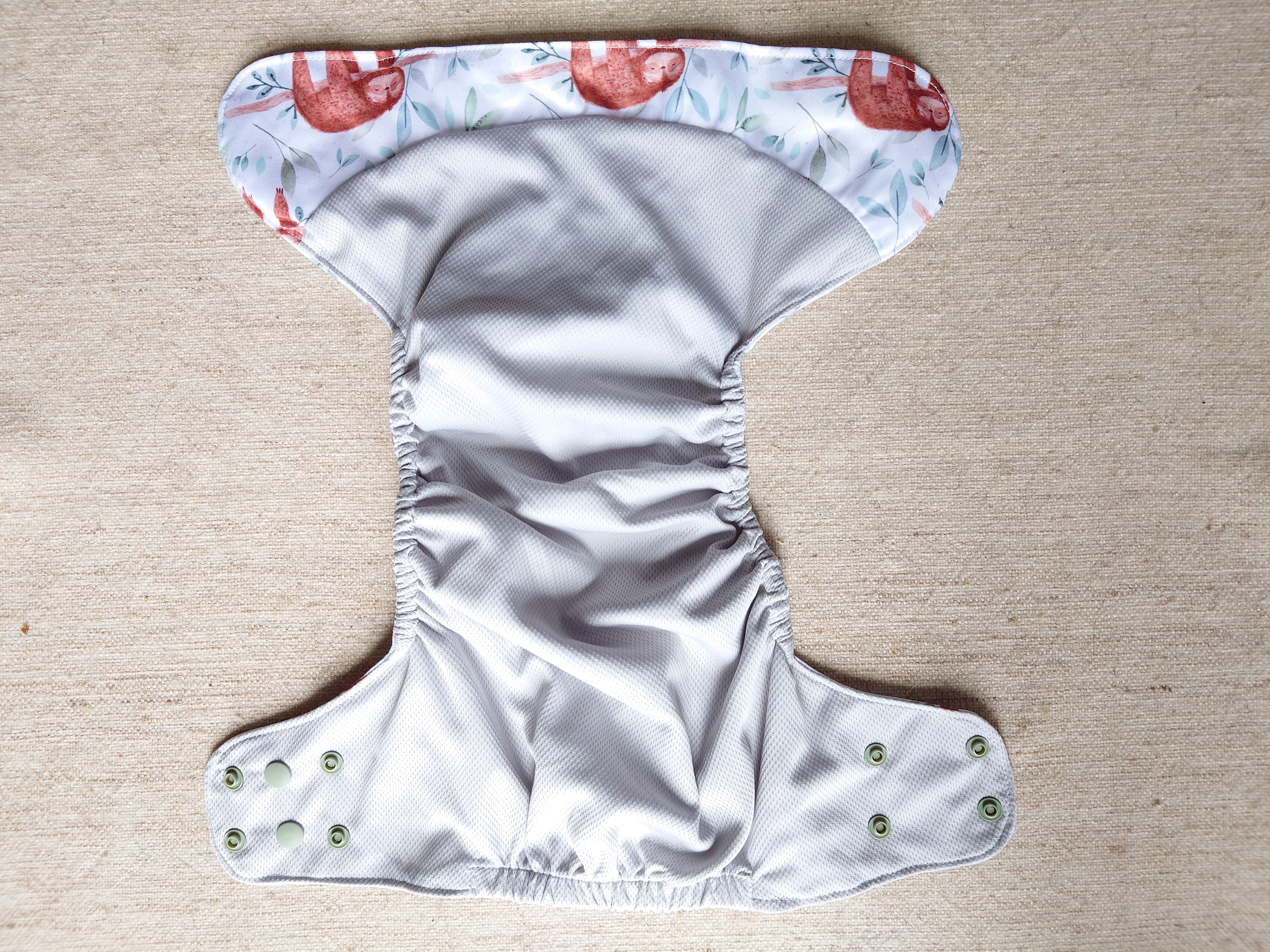 These are pocket diapers that have an athletic wicking jersey mesh that goes against the skin and a PUL exterior to keep it relatively water proof. They have four hip snaps on each side and four rows of vertical snaps to adjust length. There is also a snap in the pocket near the tummy if you like to snap in inserts. I don’t like to do that.