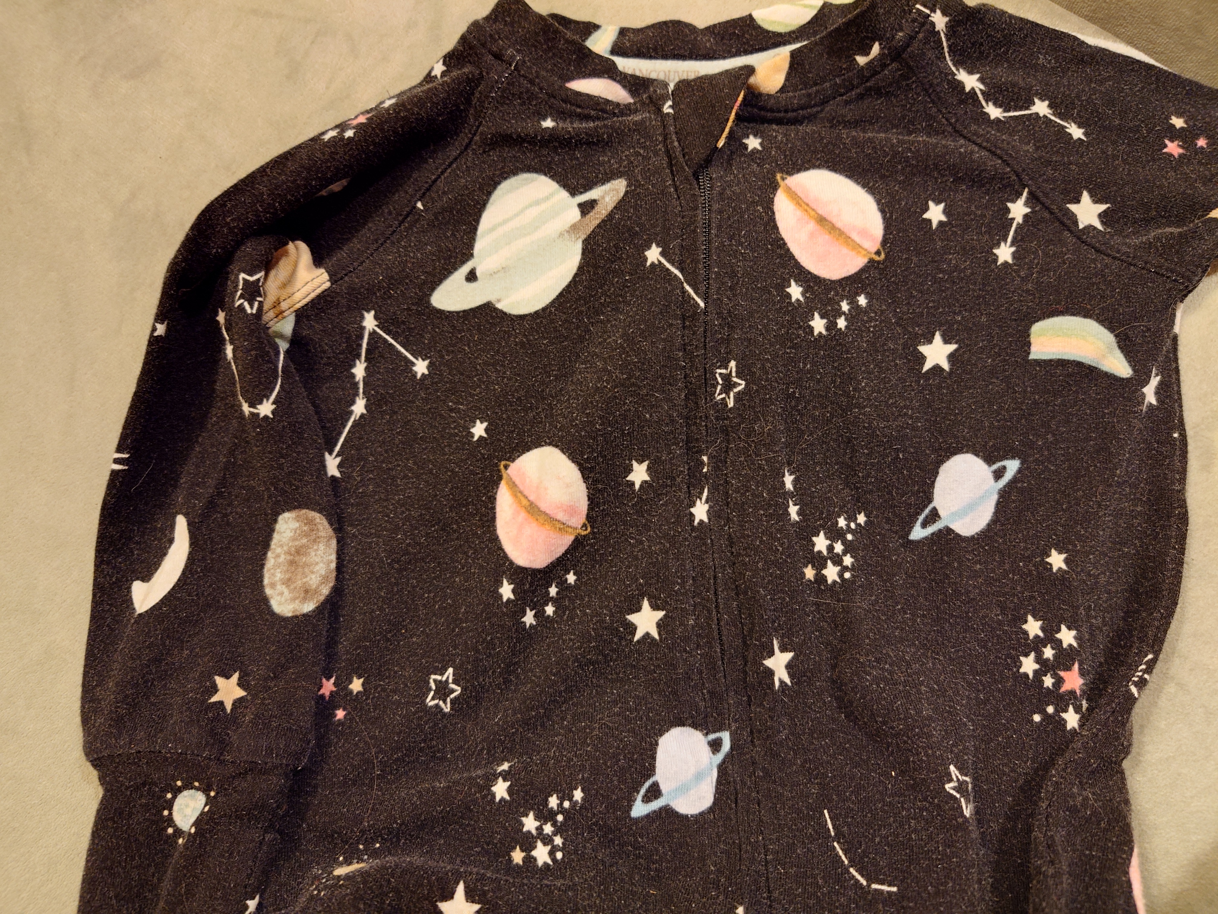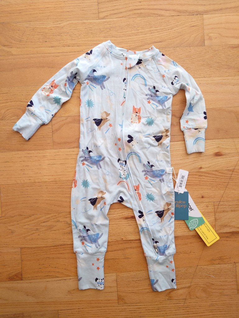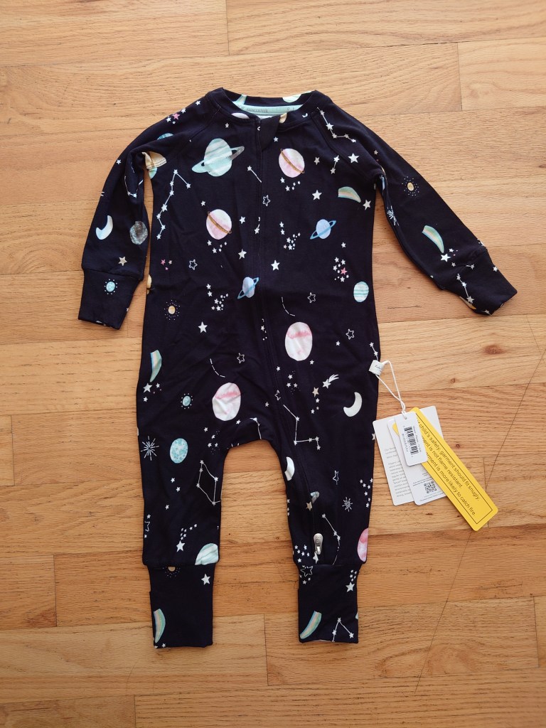 I ended up buying 5 sleepers directly from their site, the first 3 were for 6-12 months, and the last two for 12-18 months. All except for Baby Dinomite, which I had purchased at Indigo, my son needed to grow into. He obviously eventually did, and at 21 months, my son is still using Planets and Superhero Dog (size 12-18 months). The black on the Planets was gorgeous before I washed it. Because I wash warm and tumble dry, the pilling quickly showed up as white, making it look more grey overall. The pilling is very low, but widespread, which is only noticeable on the other colours if you look hard. I have both Lyocell & Spandex blends as well as Lyocell, Spandex, and Cotton blends. I prefer the cotton blends as they are a little thicker with more structure to them so they fold better.